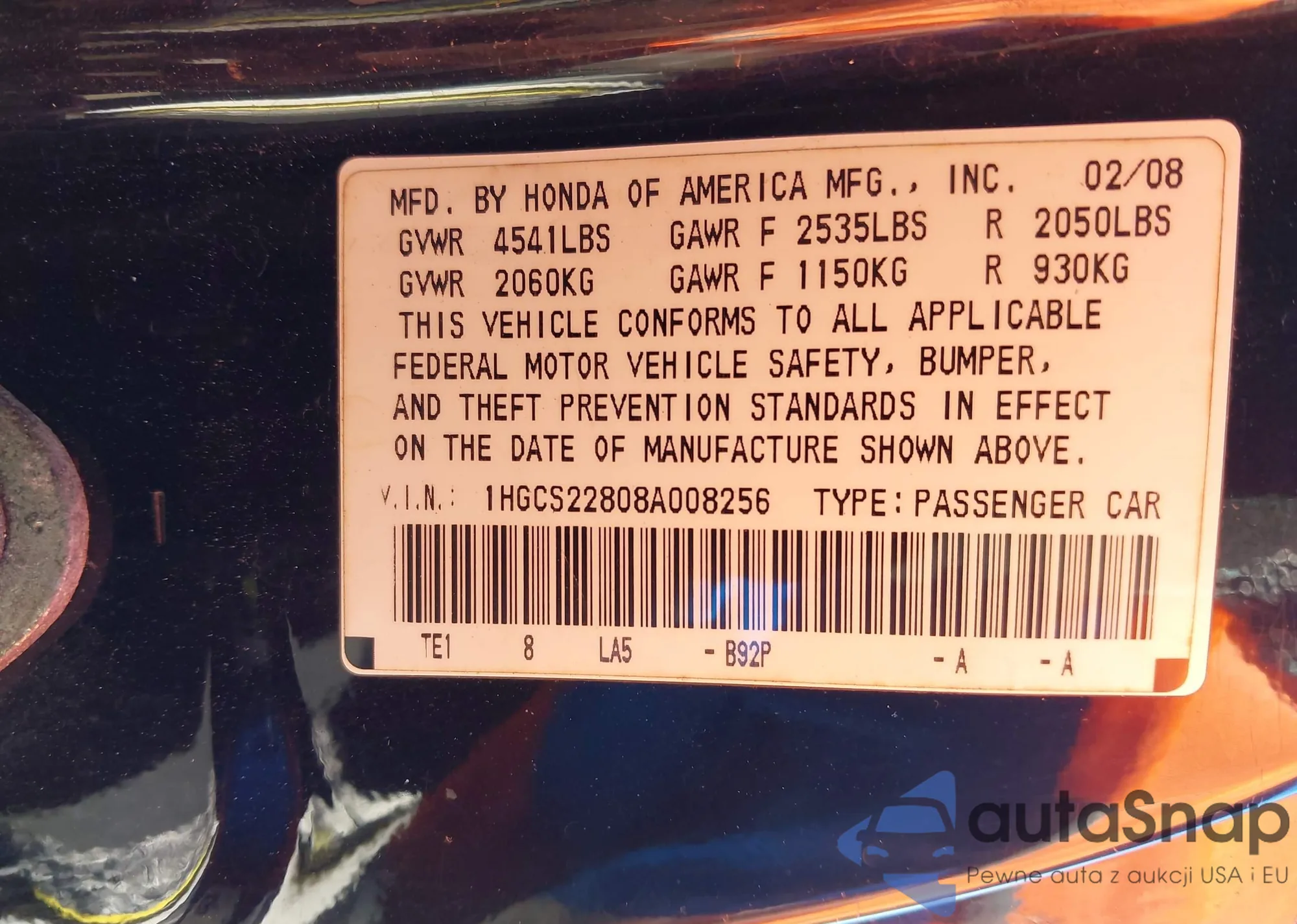 LOT: 43918613 VIN: 1HGCS22808A008256
