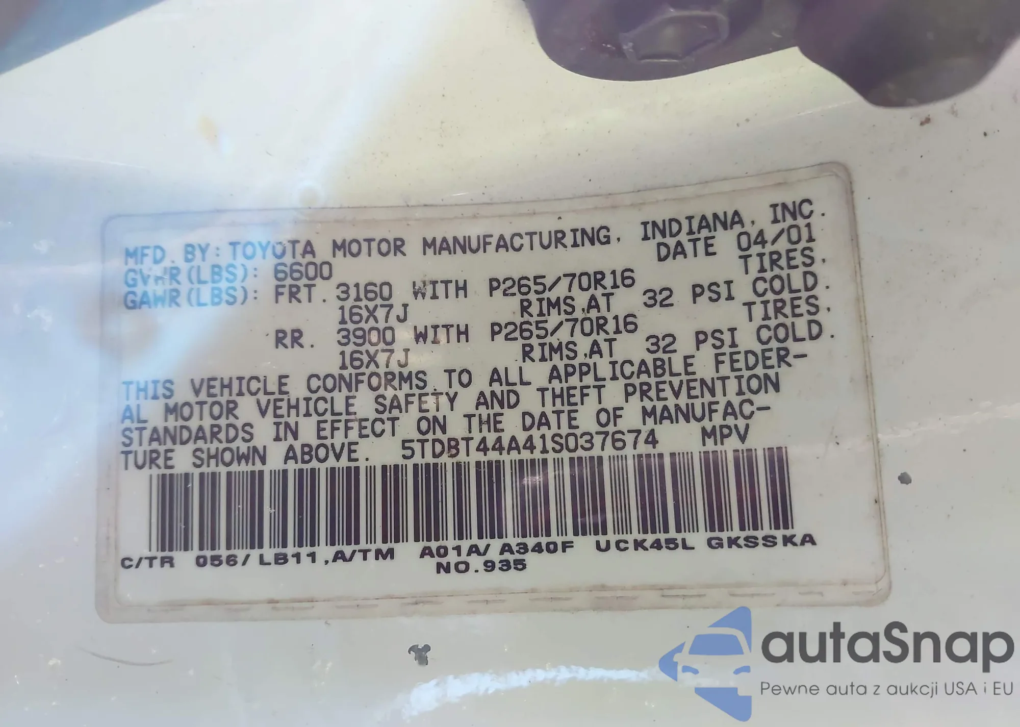 LOT: 43882890 VIN: 5TDBT44A41S037674