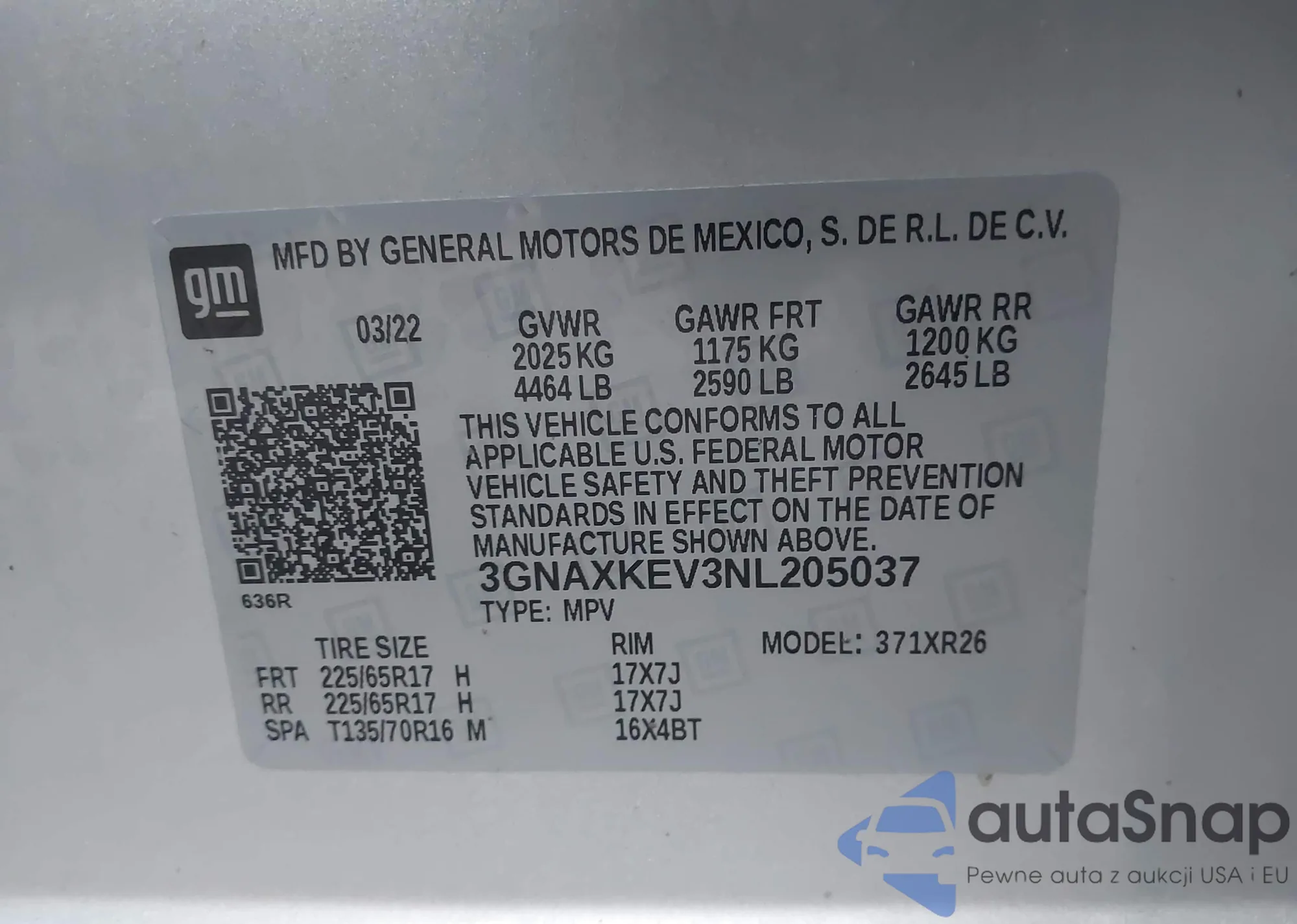 • VIN 3GNAXKEV3NL205037