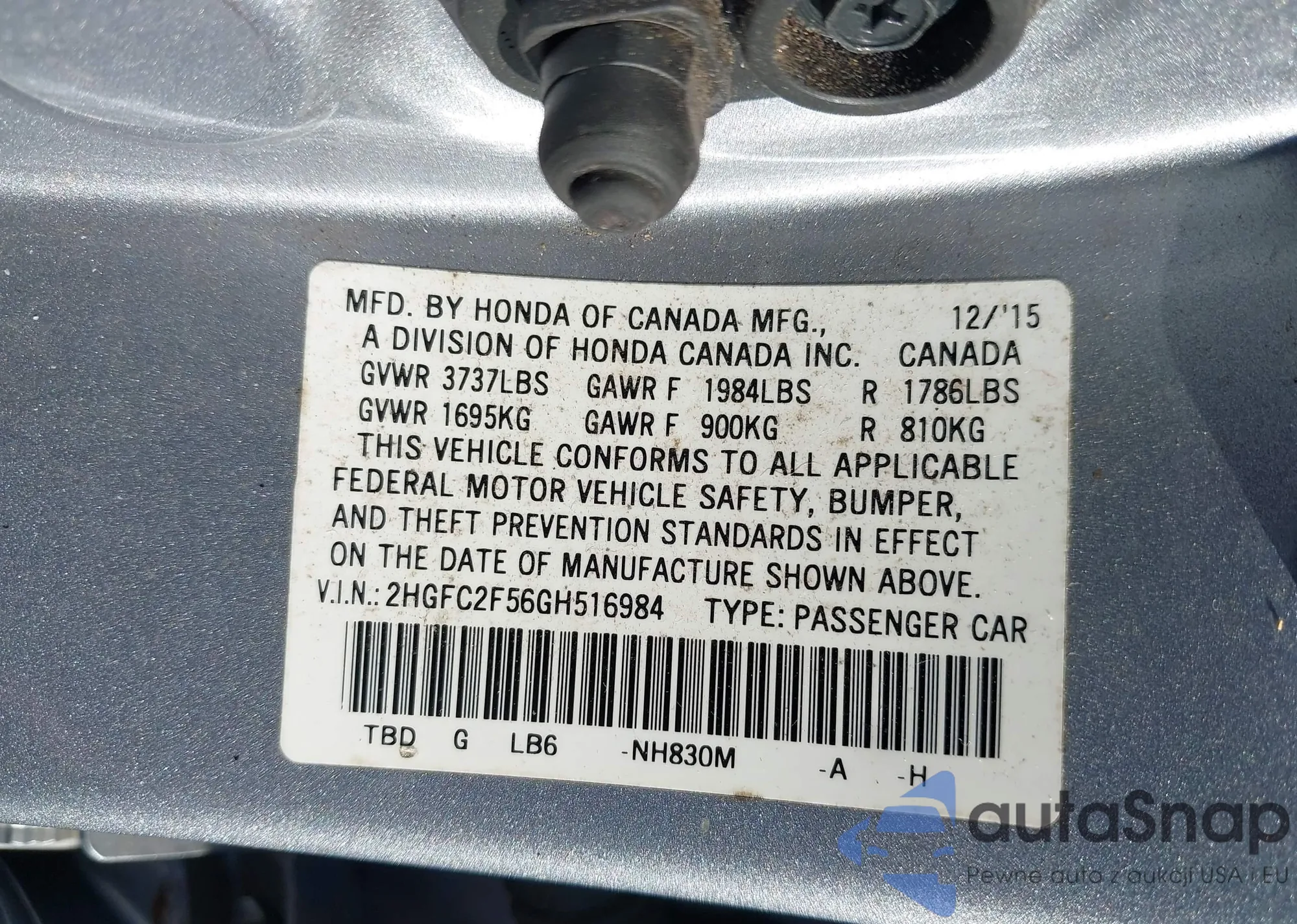 LOT: 43710306 VIN: 2HGFC1F31GH630531