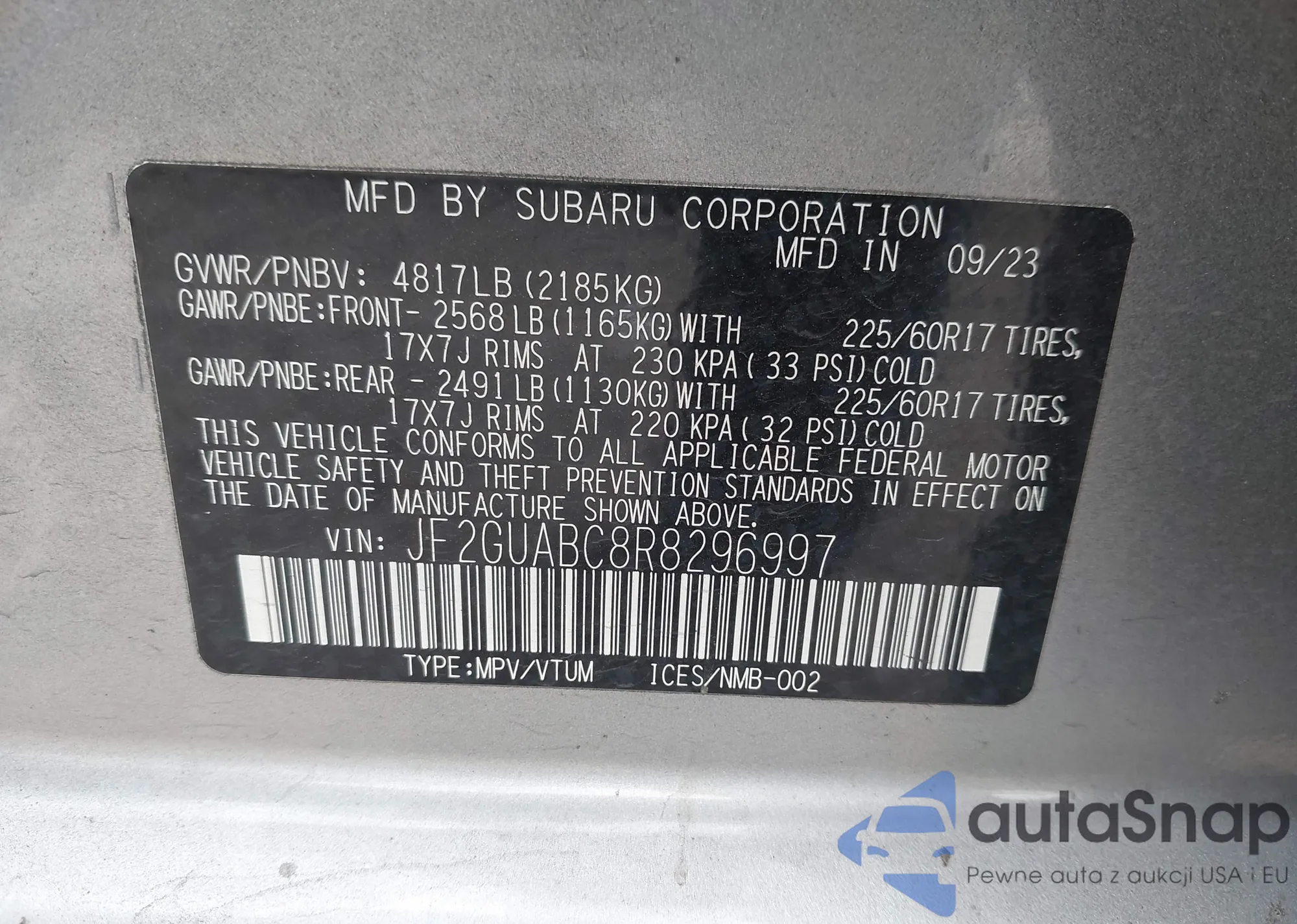 LOT: 43704182 VIN: JF2GUABC8R8296997