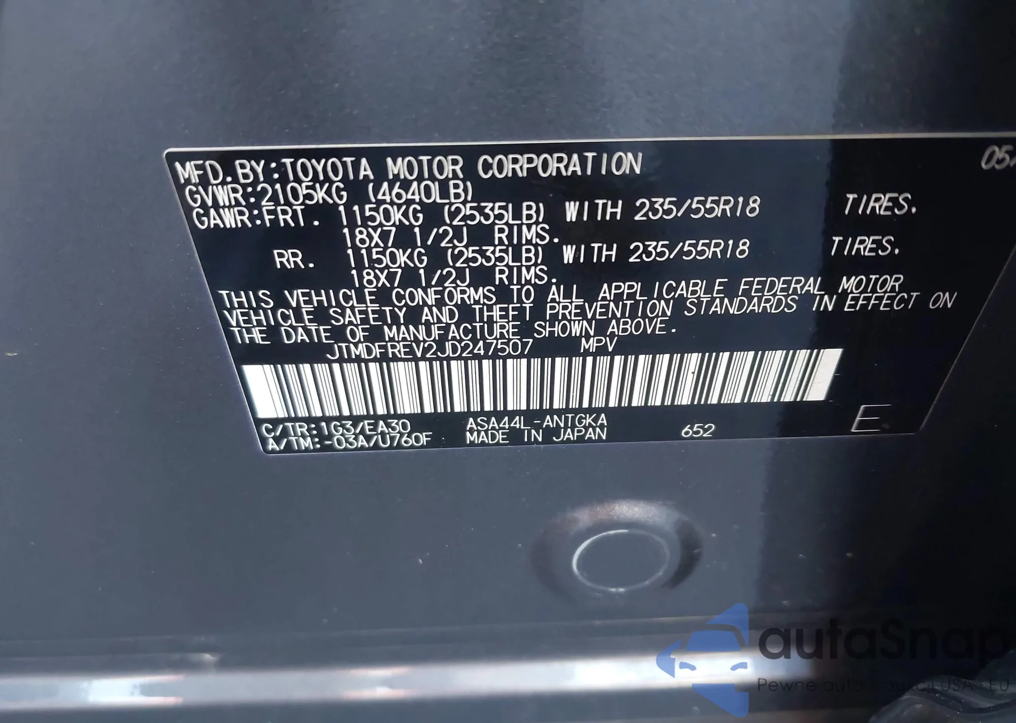 LOT: 43712271 VIN: JTMDFREV2JD247507