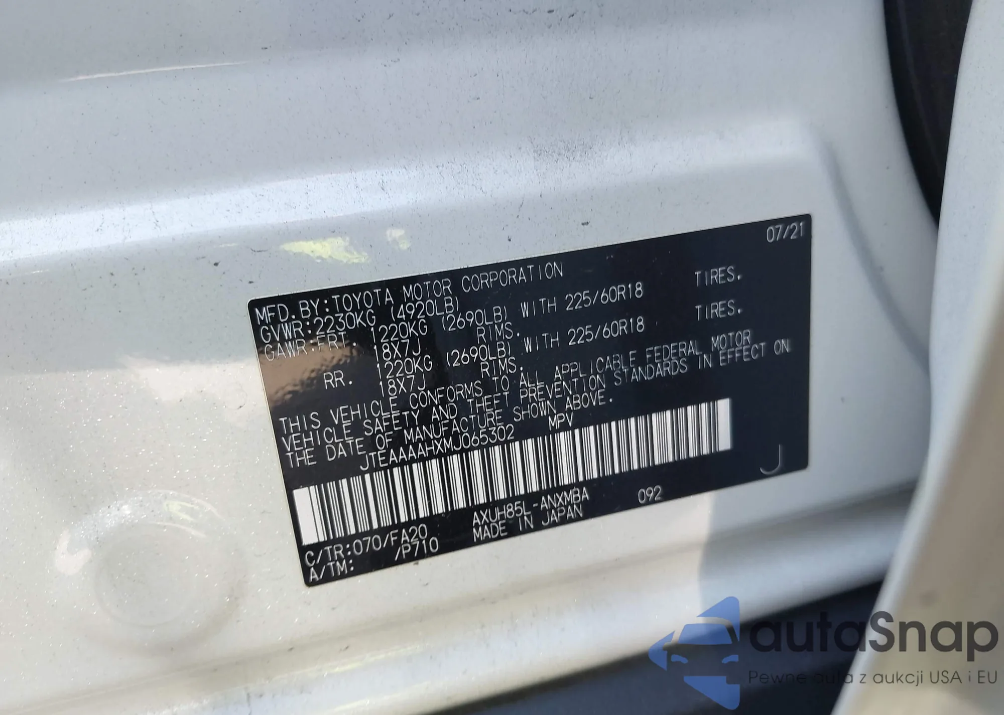 LOT: 43717637 VIN: JTDEPMAE7MJ118890