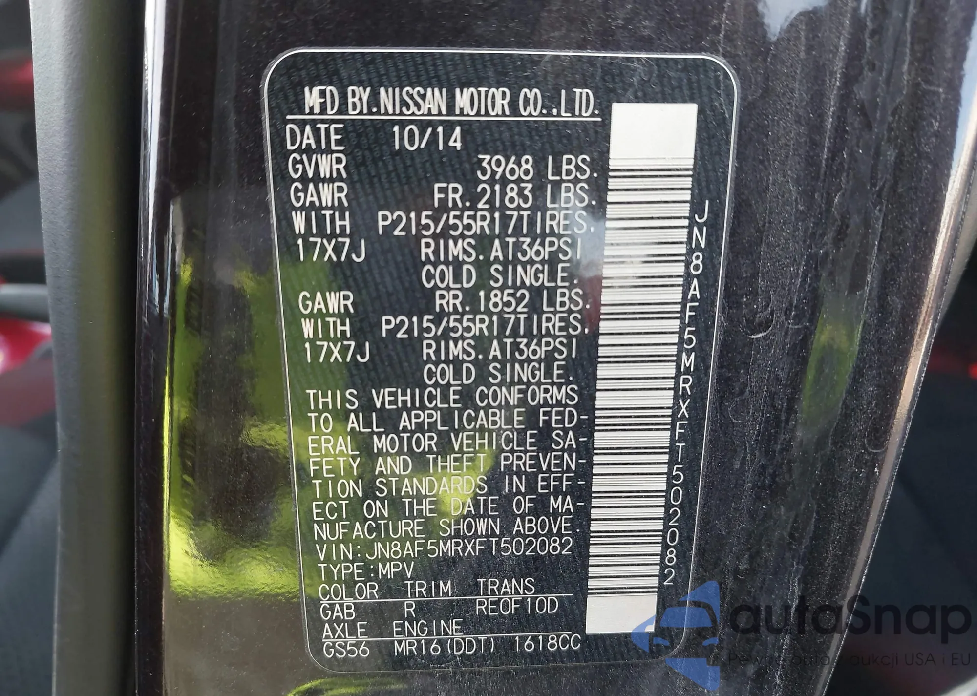 LOT: 43771599 VIN: JN8AF5MRXFT502082