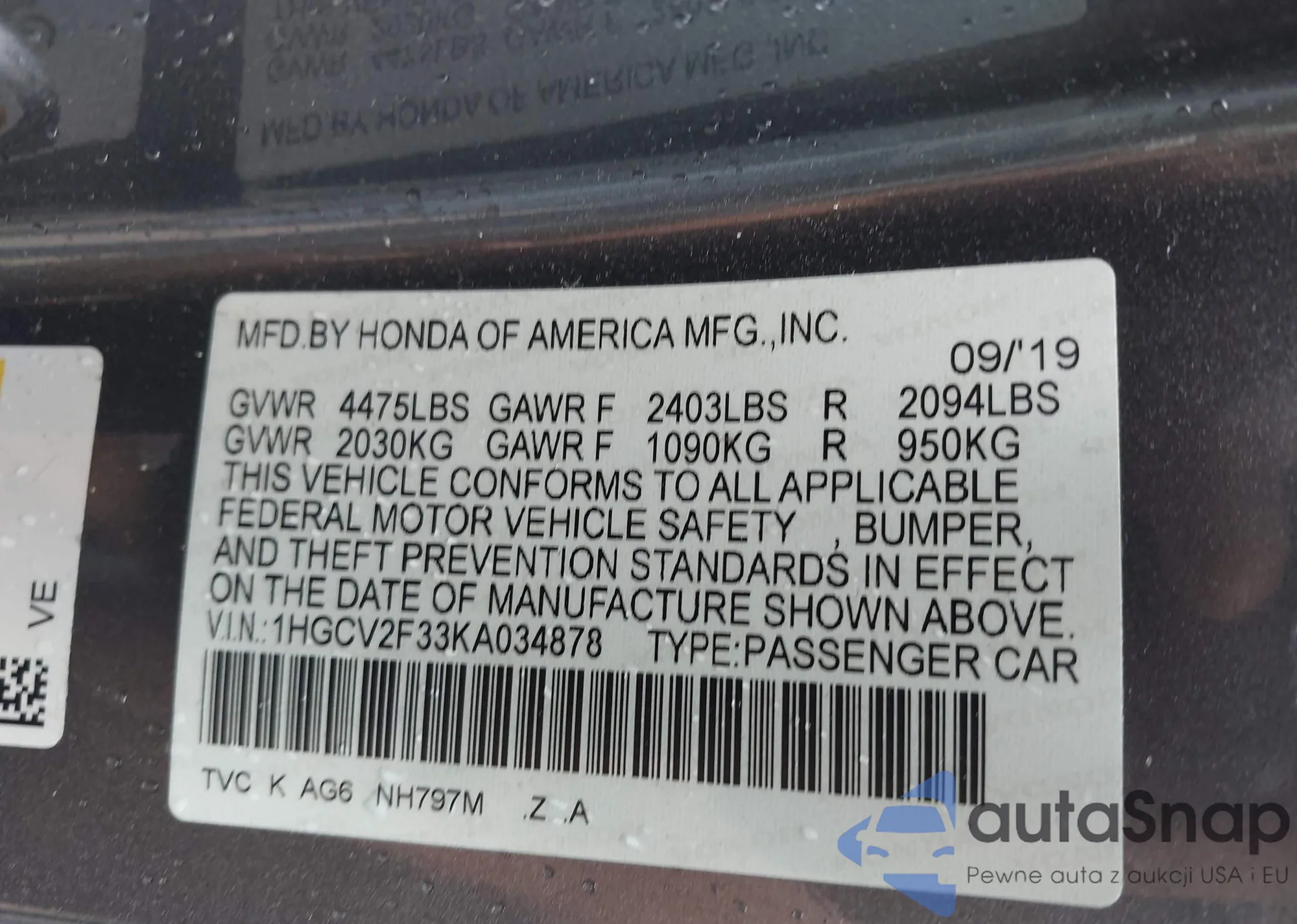 LOT: 43384239 VIN: 1HGCY2F56RA074228