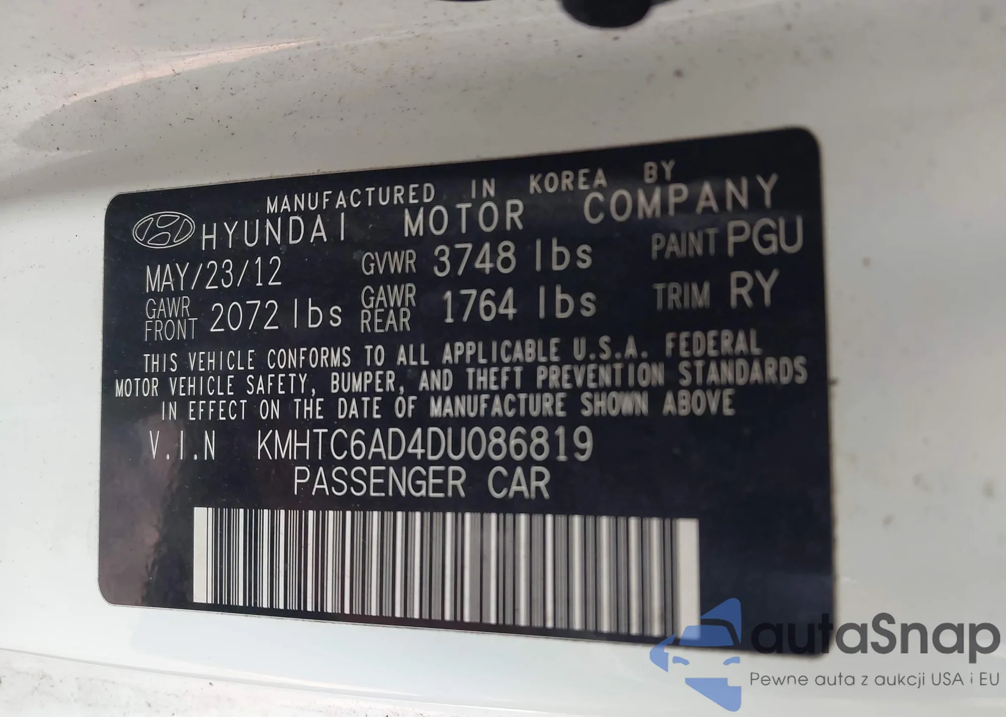 • VIN KMHTC6AD4DU086819