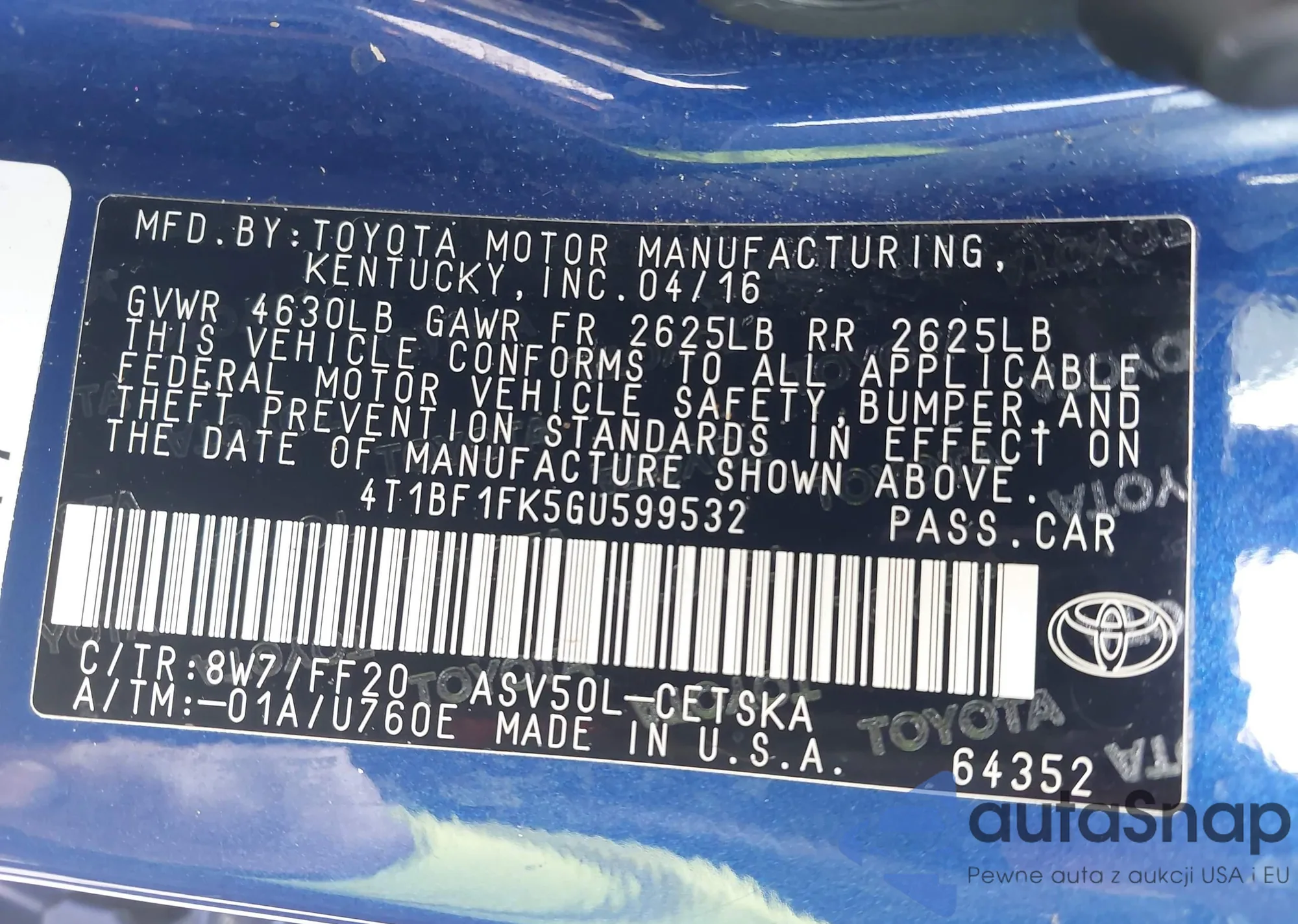 LOT: 43374474 VIN: 4T1BF1FK5GU599532