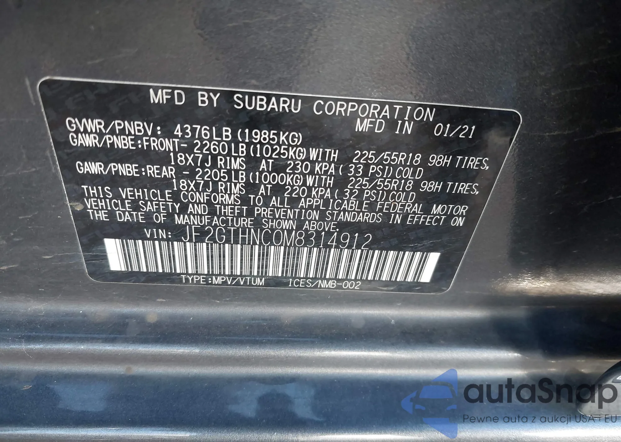 LOT: 43520042 VIN: JF2GTHNC0M8314912