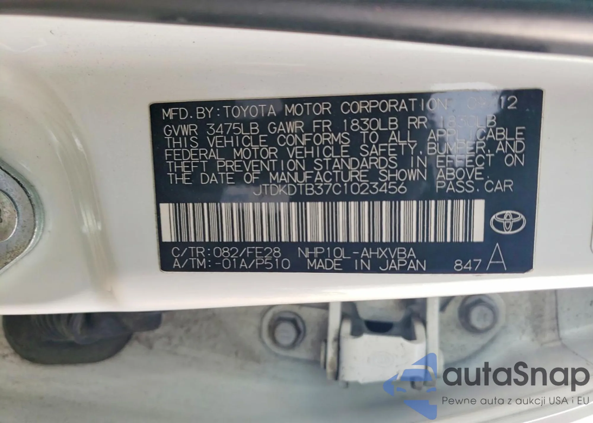 LOT: 99648515 VIN: JTDKDTB37C1023456