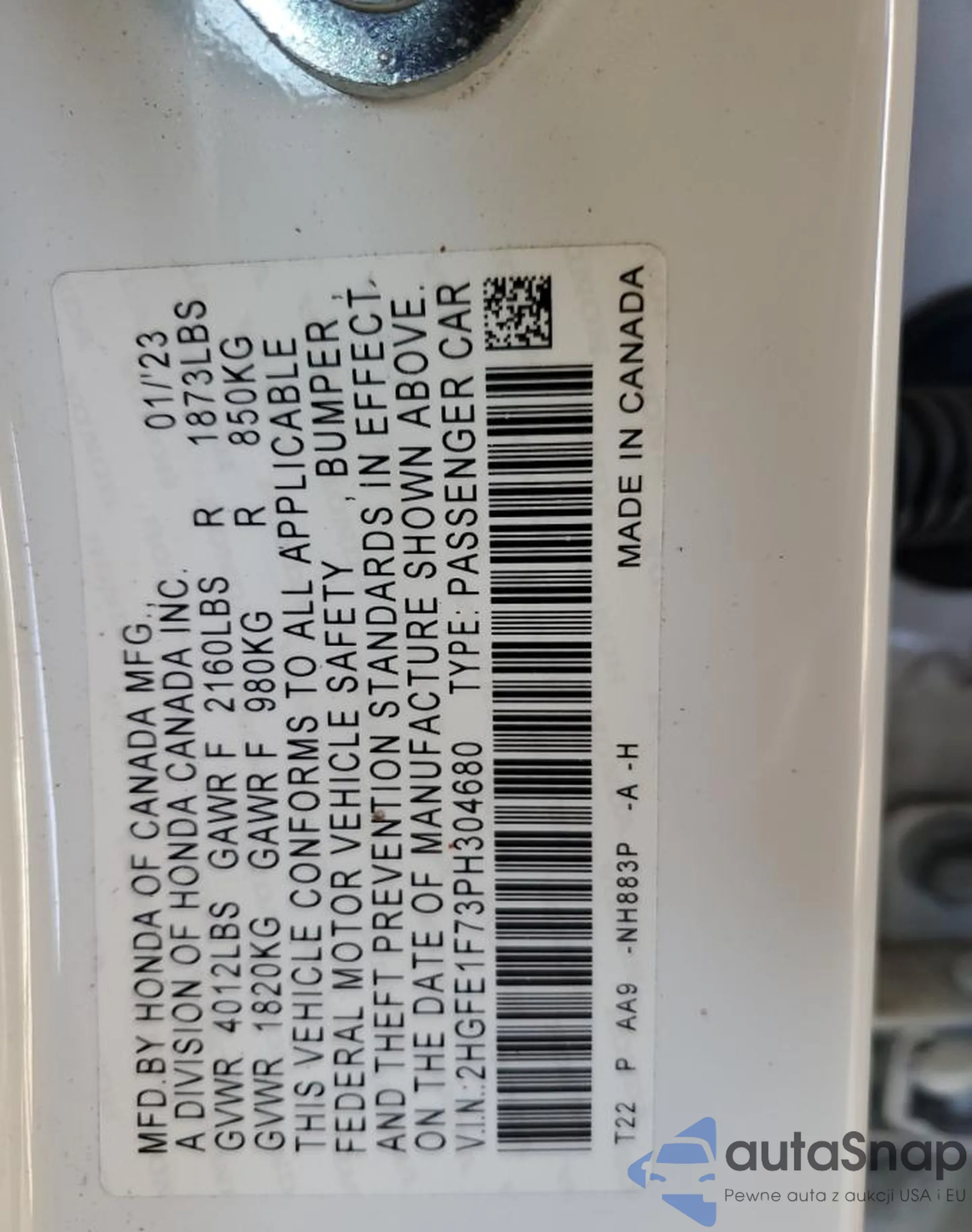• VIN 2HGFE1F73PH304680