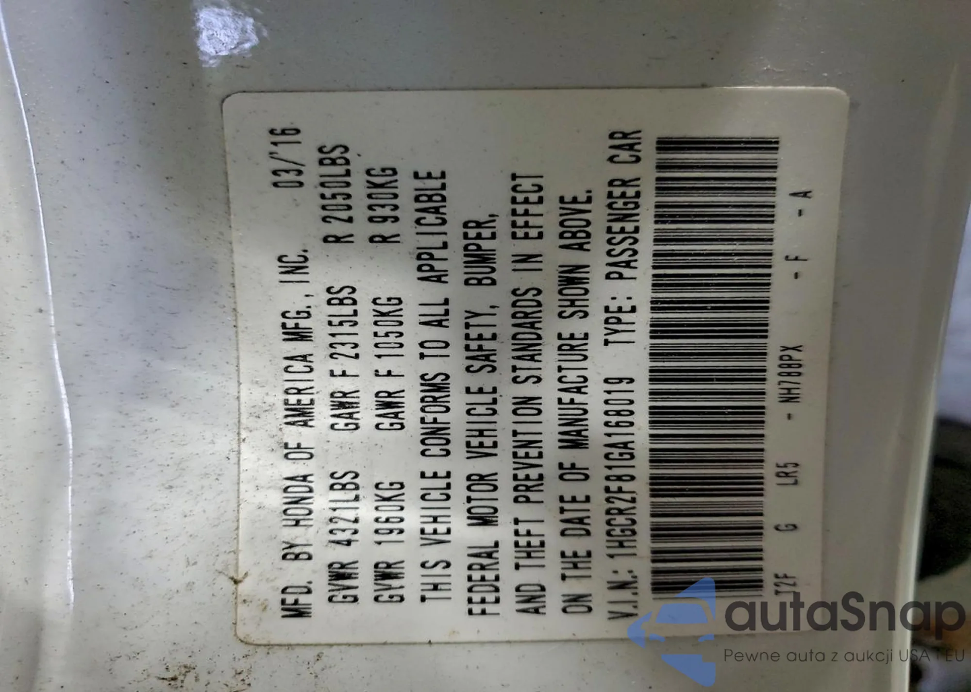 LOT: 98374075 VIN: 1HGCR2F81GA168019