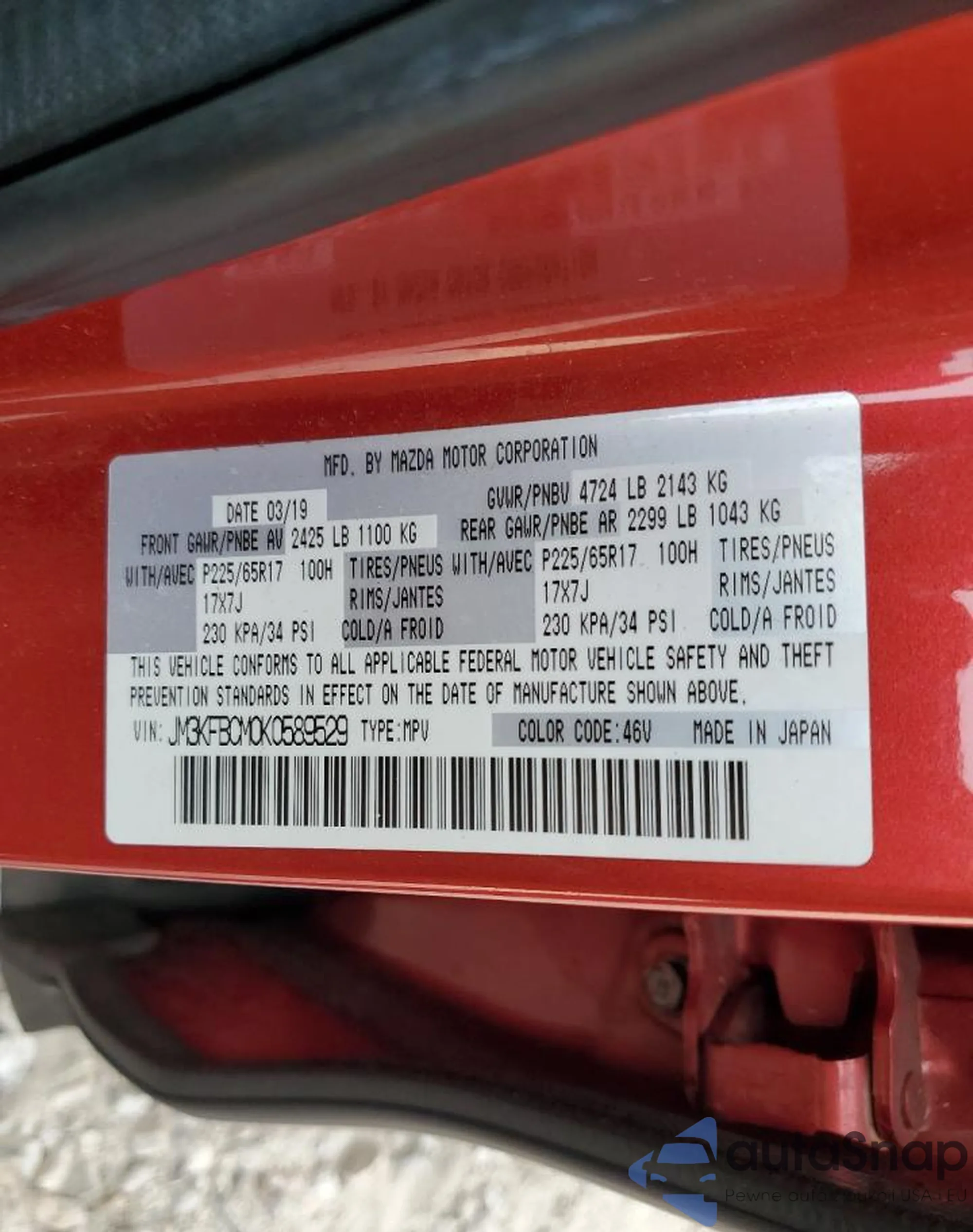 LOT: 94029255 VIN: JM3TCBDY3M0502255