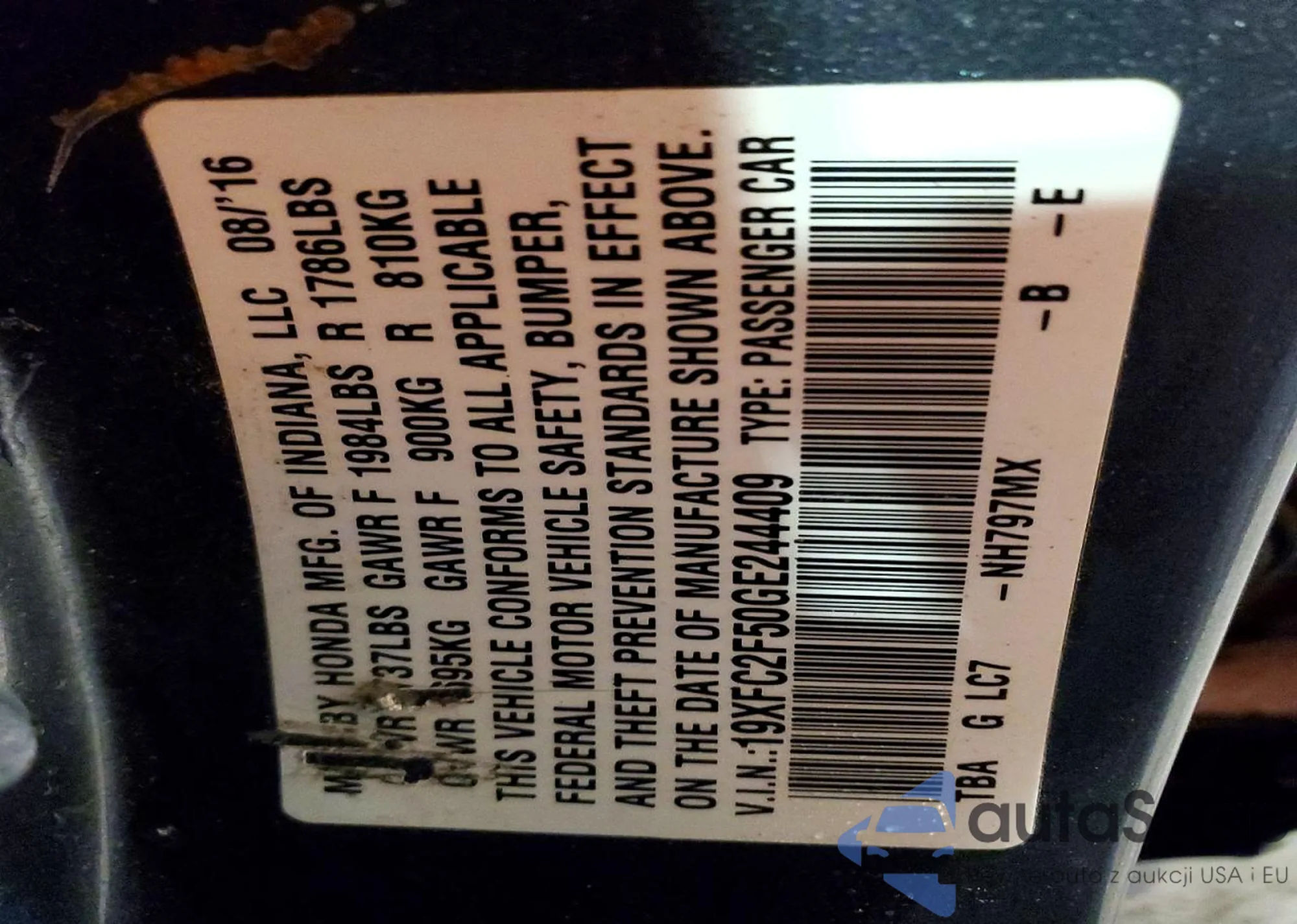 LOT: 98857585 VIN: 19XFC2F50GE244409