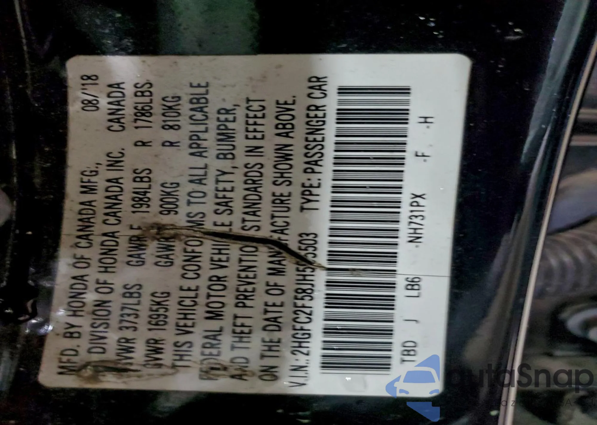 • VIN 2HGFC2F58JH595503