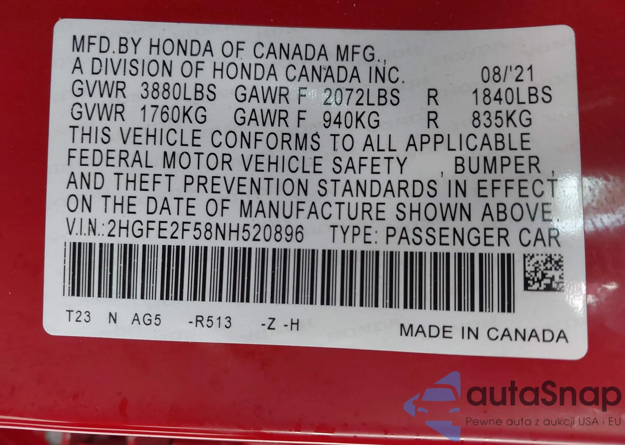 LOT: 43367036 VIN: 2HGFE2F58NH520896