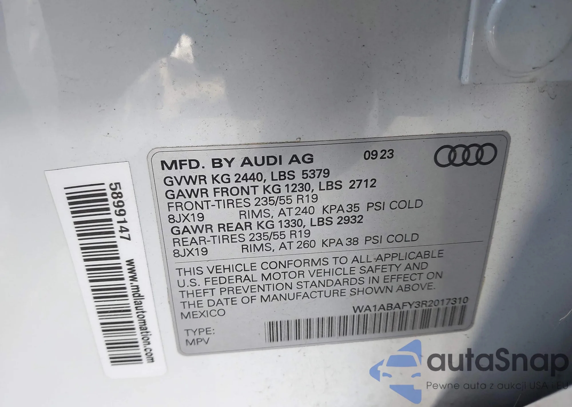 LOT: 43928724 VIN: WA1ABAFY3R2017310