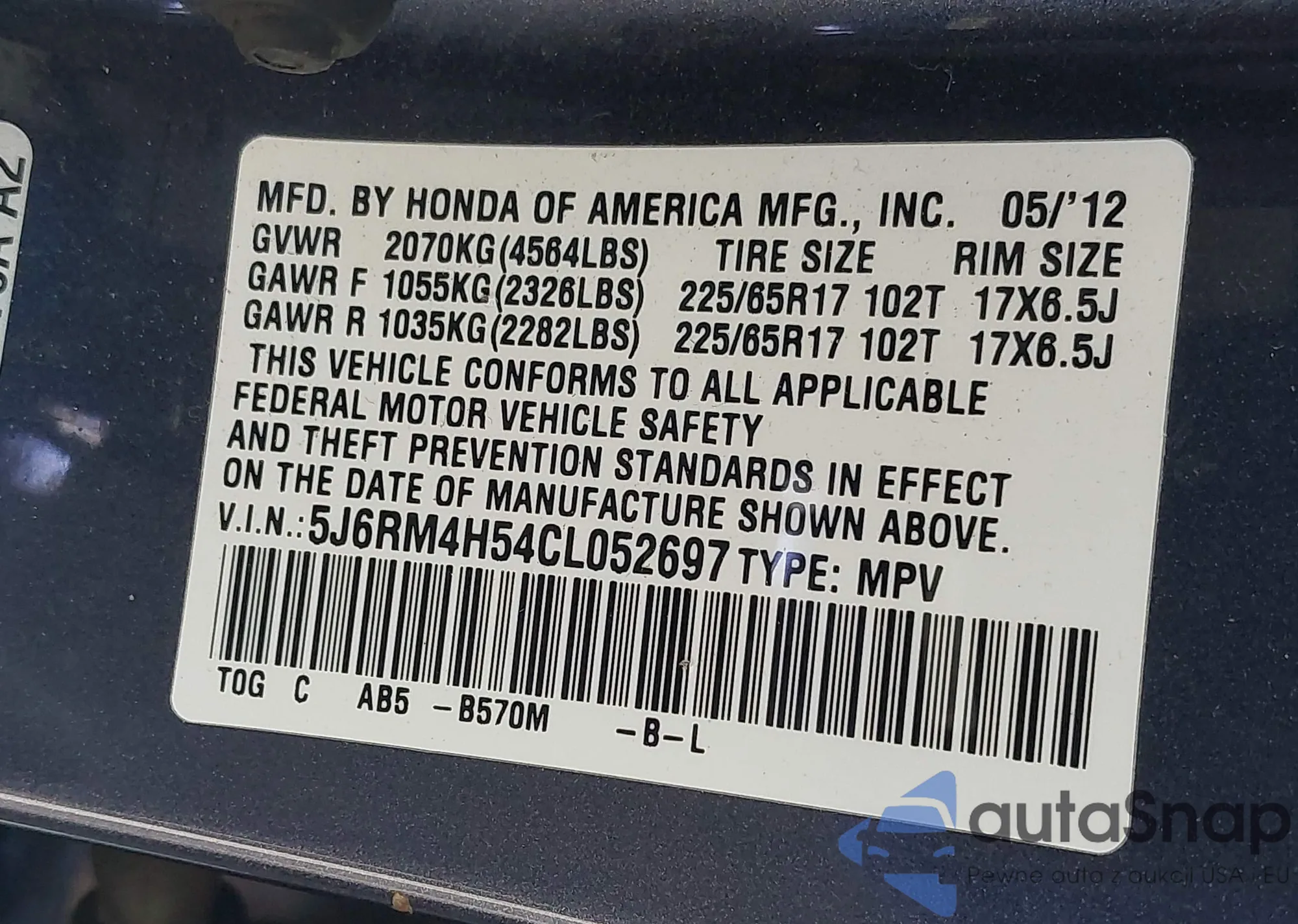• VIN 5J6RM4H54CL052697
