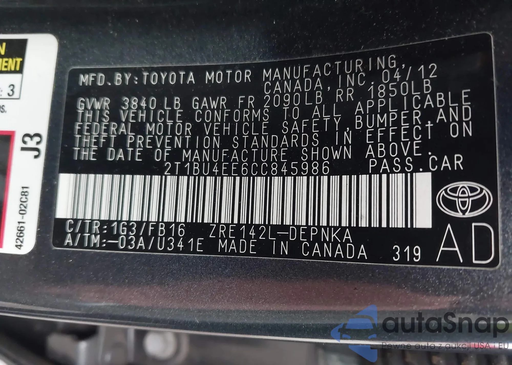 • VIN 2T1BU4EE6CC845986
