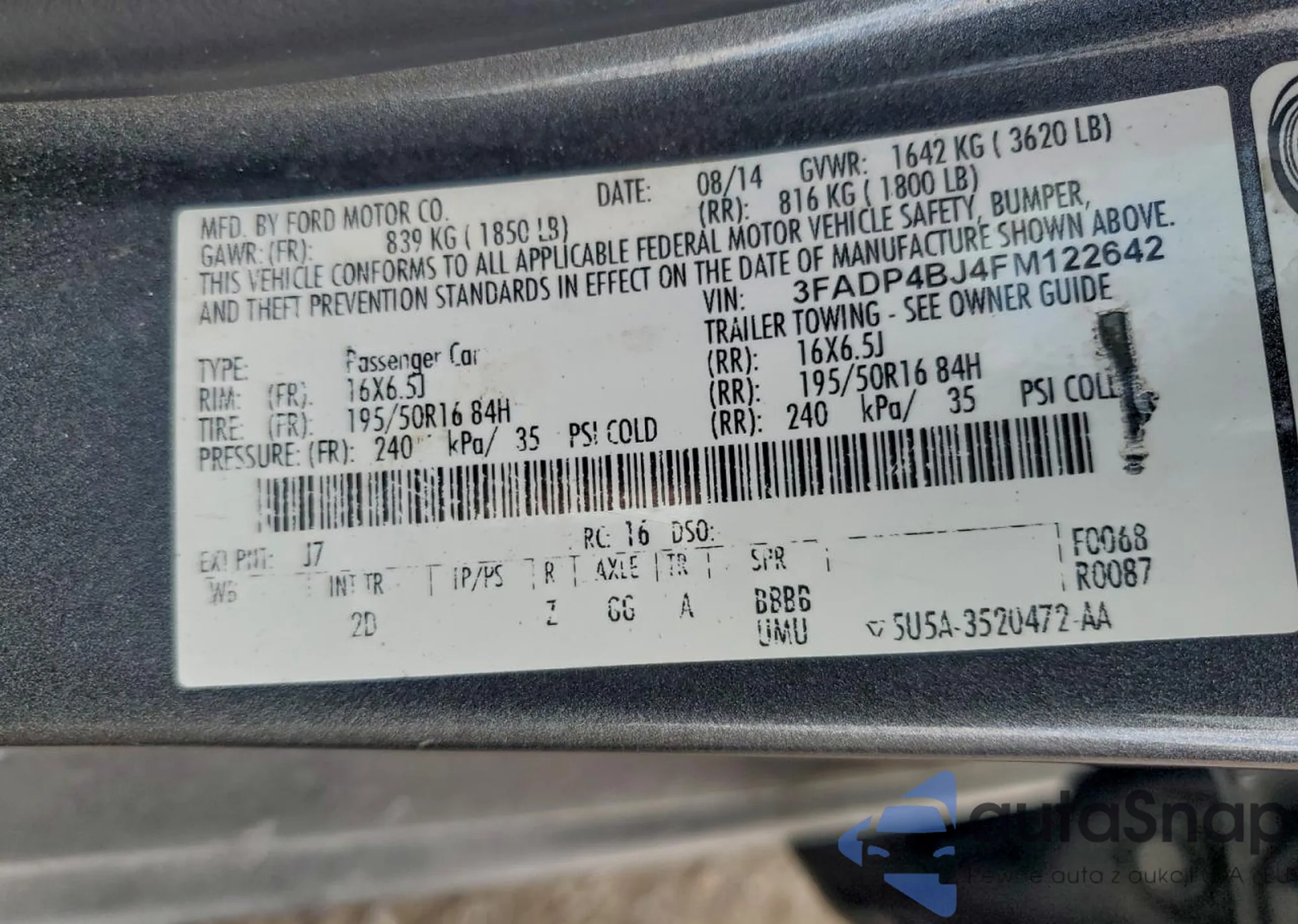 LOT: 99619885 VIN: 3FADP4BJ4FM122642