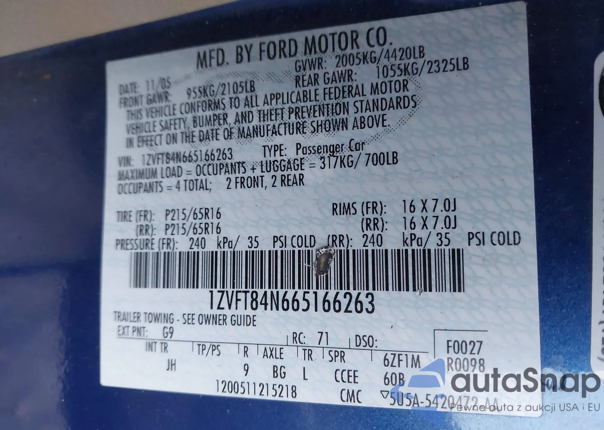 LOT: 44003387 VIN: 1ZVFT84N665166263
