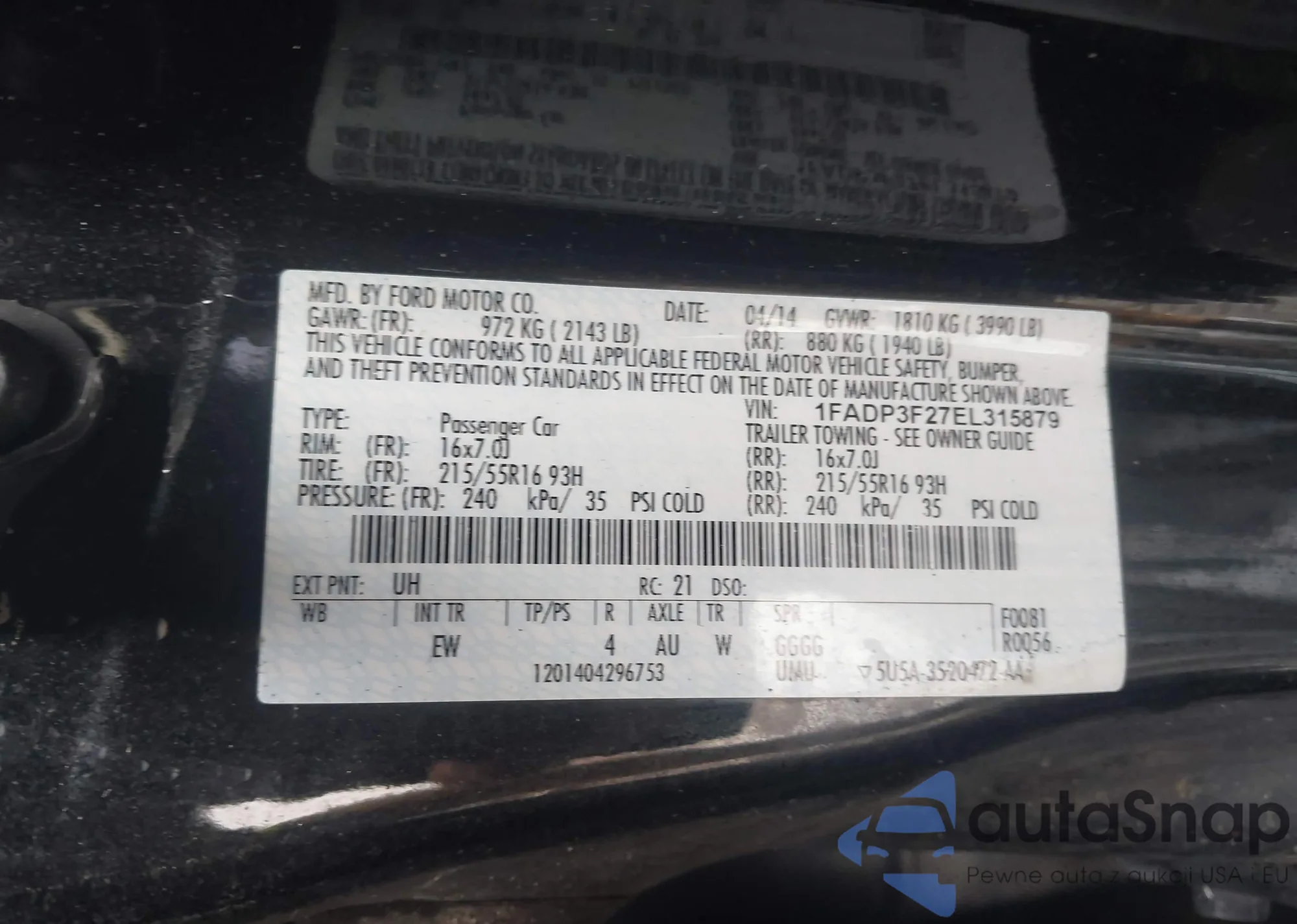 LOT: 43798508 VIN: 1FADP3F27EL315879