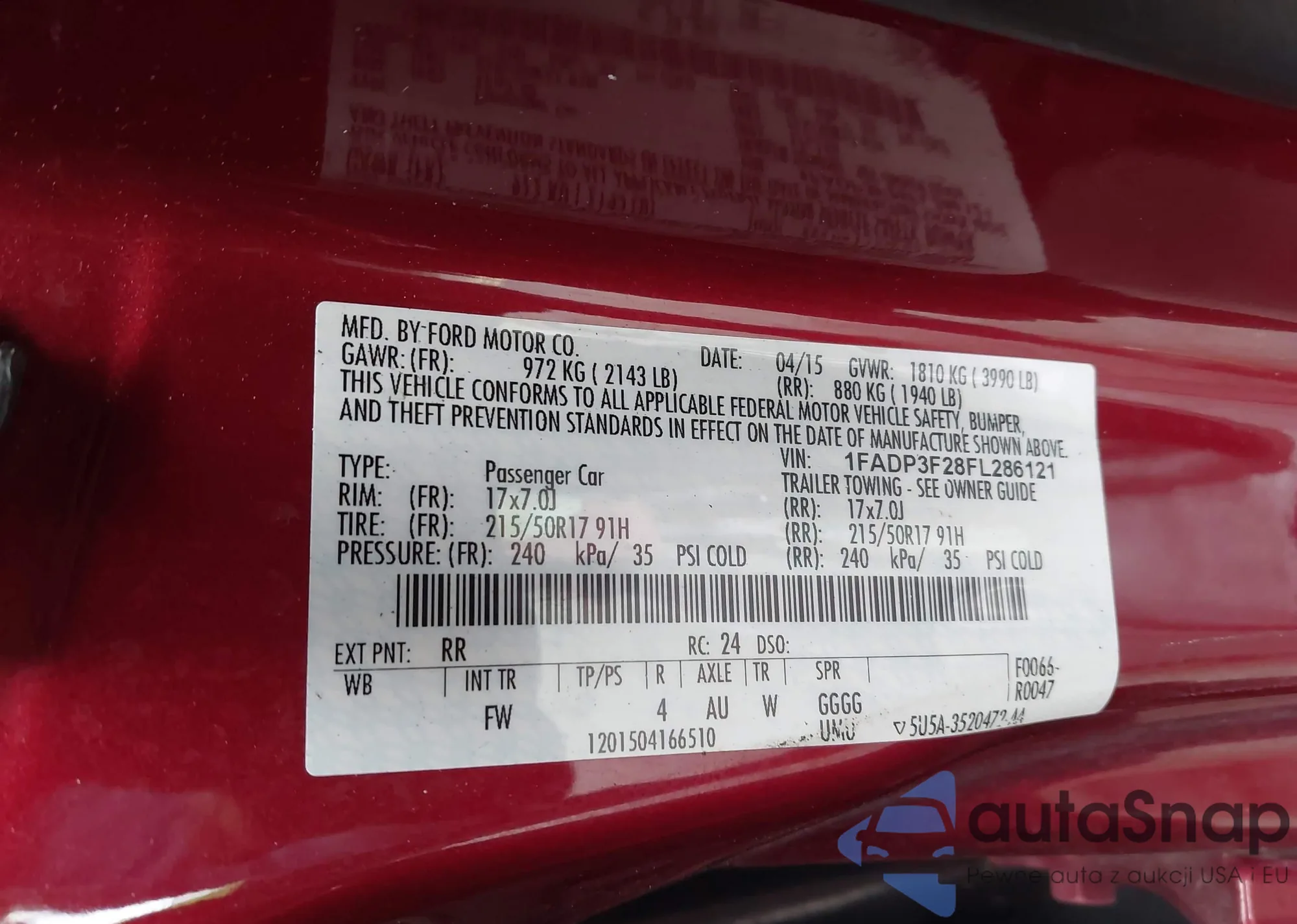LOT: 43946942 VIN: 1FADP3F28FL286121
