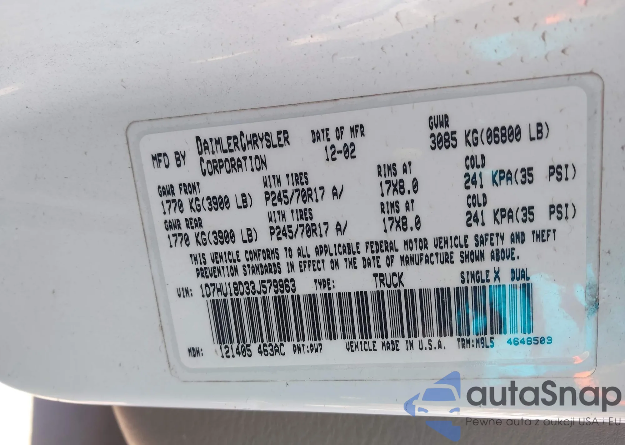 2003 Dodge Ram 1500 Slt/Laramie/St from USA, damaged, VIN 1D7HU18D33J579963