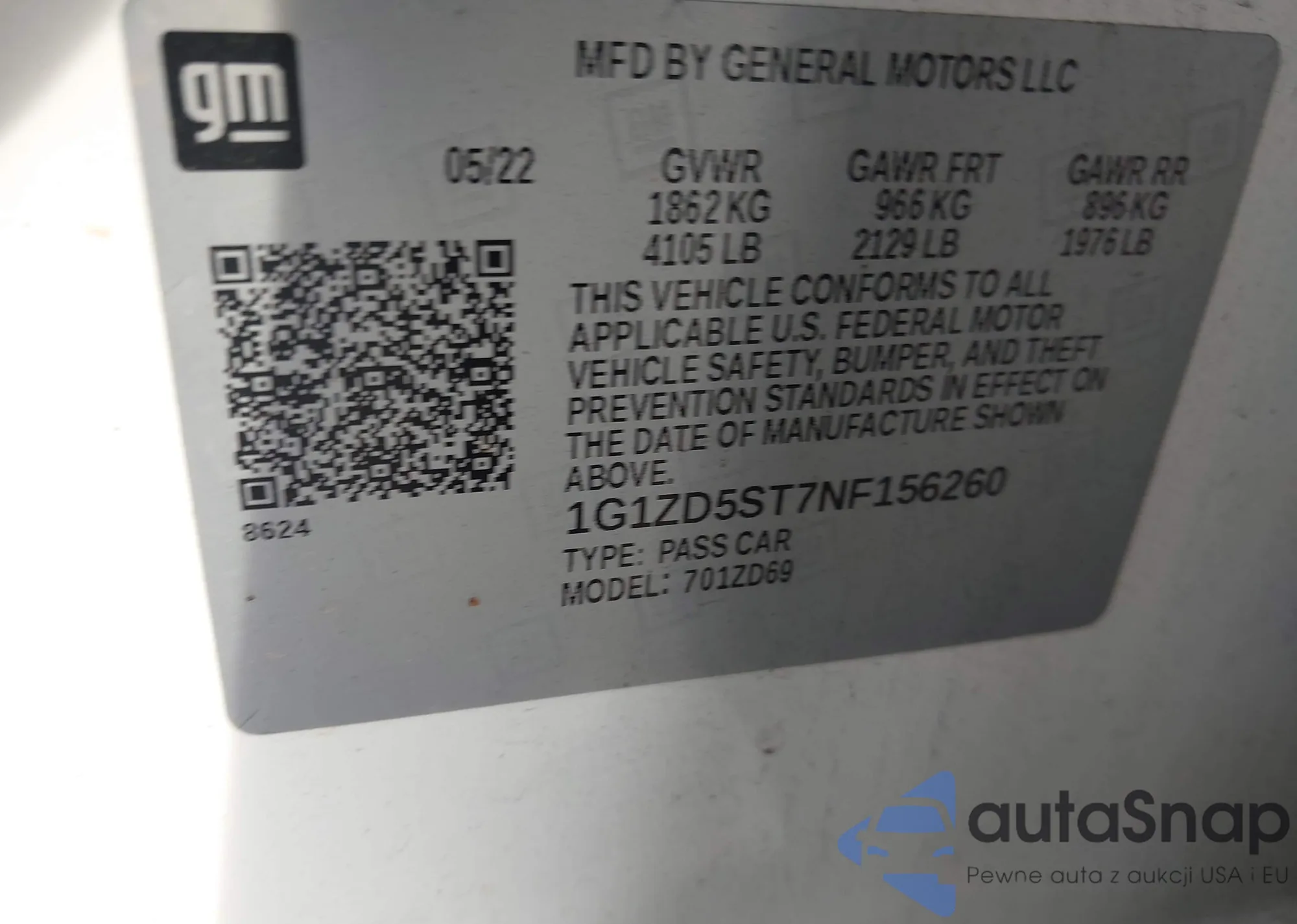 LOT: 43983562 VIN: 1G1ZD5ST7NF156260