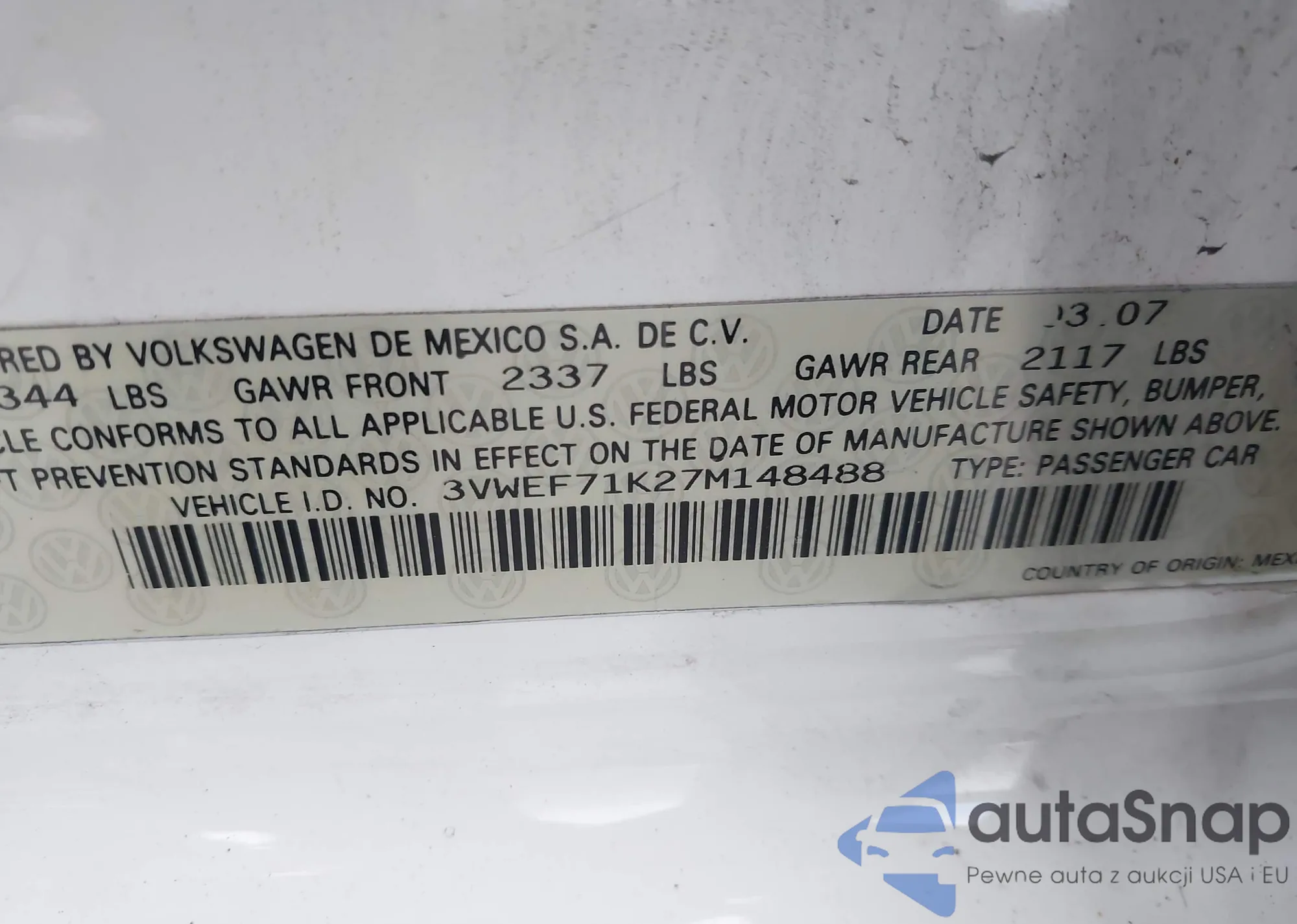 • VIN 3VWEF71K27M148488