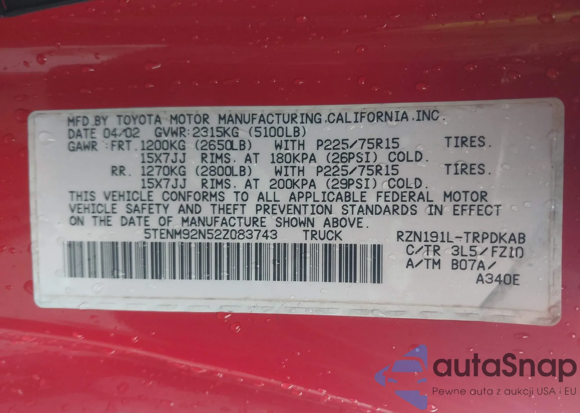• VIN 5TENM92N52Z083743