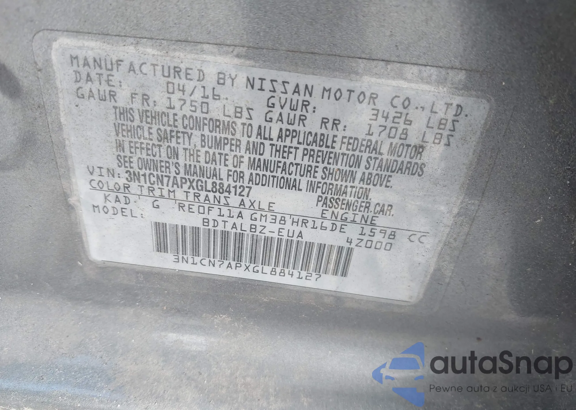 • VIN 3N1CN7APXGL884127