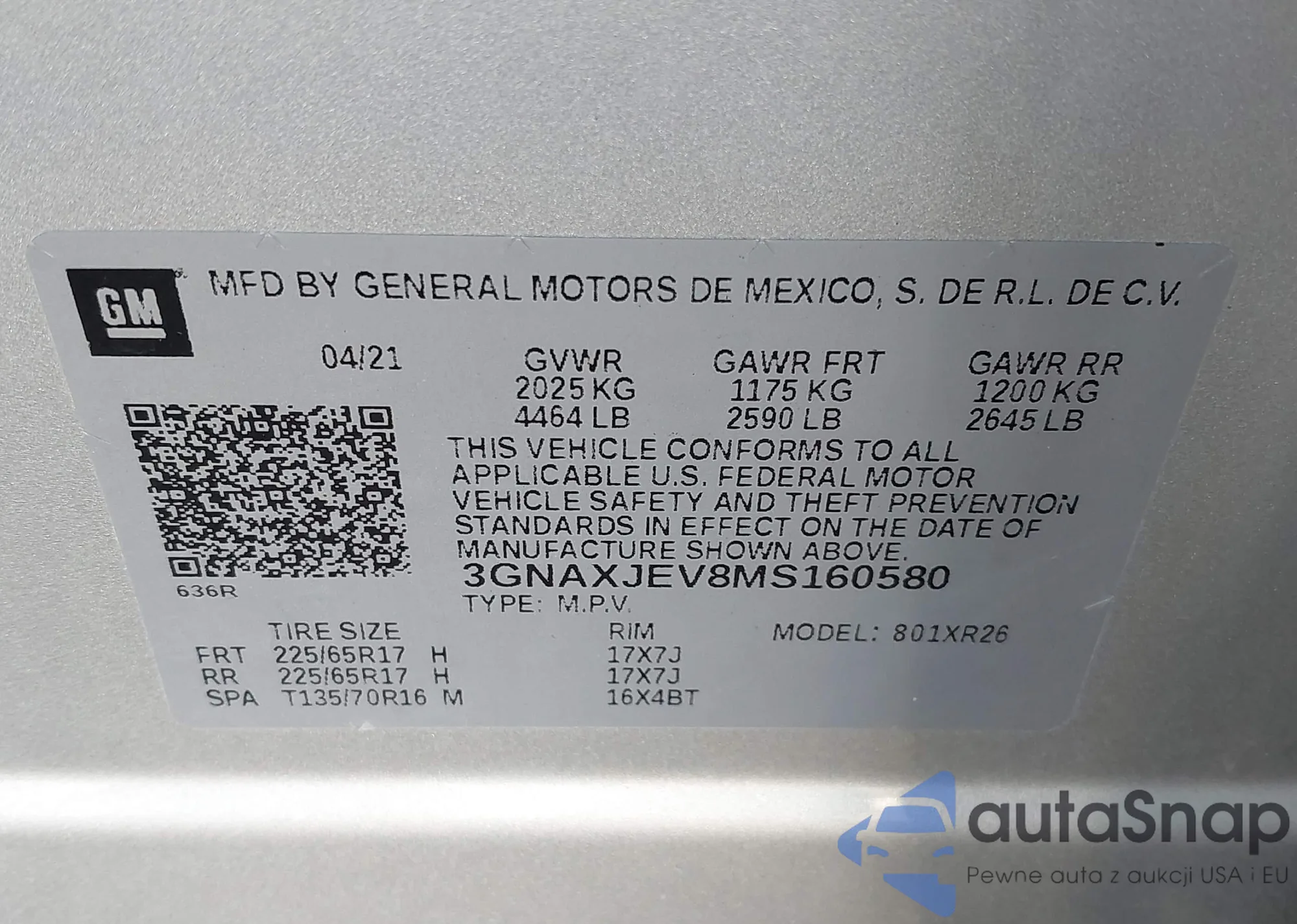 • VIN 3GNAXJEV8MS160580