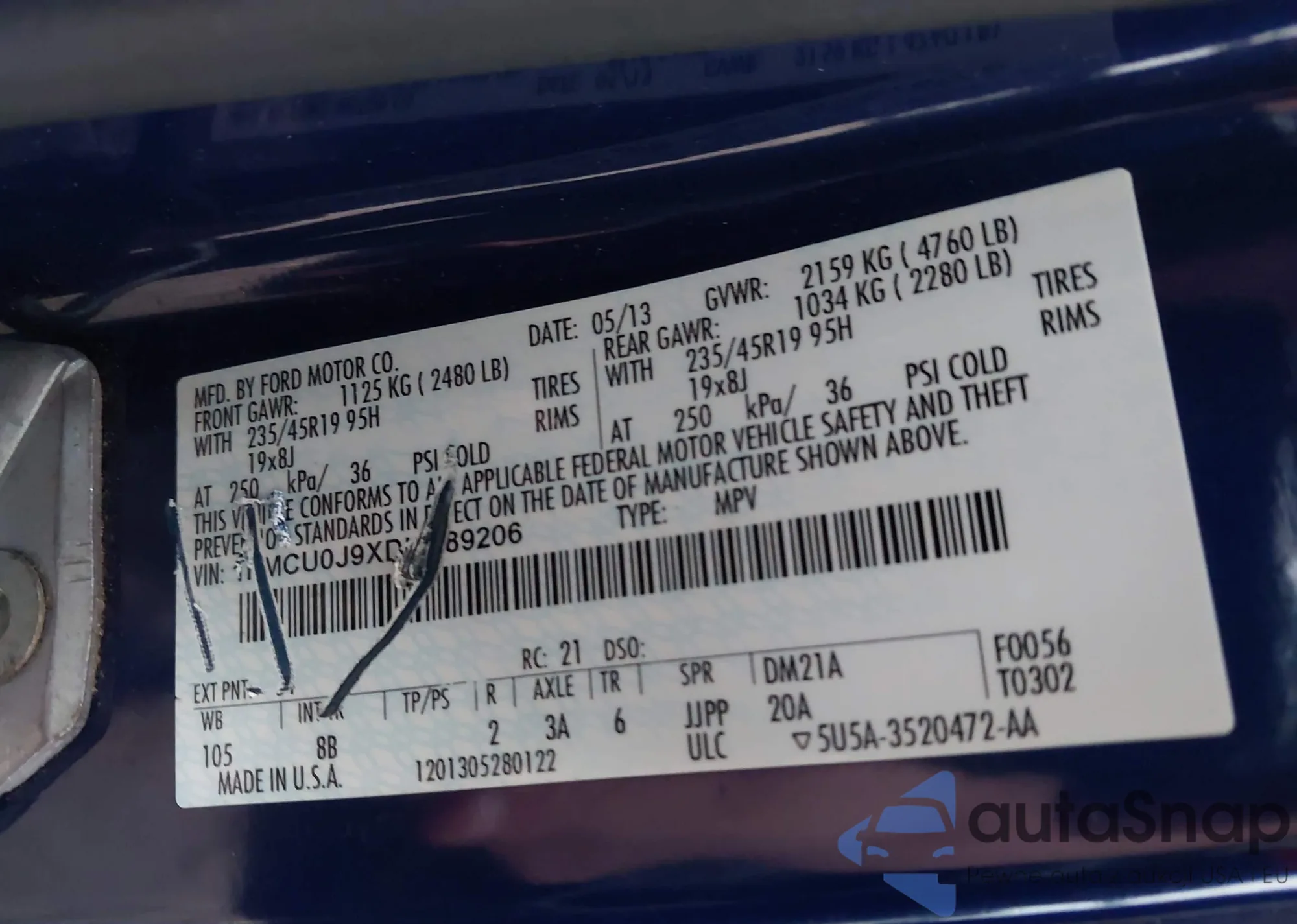 • VIN 1FMCU0J9XDUD89206