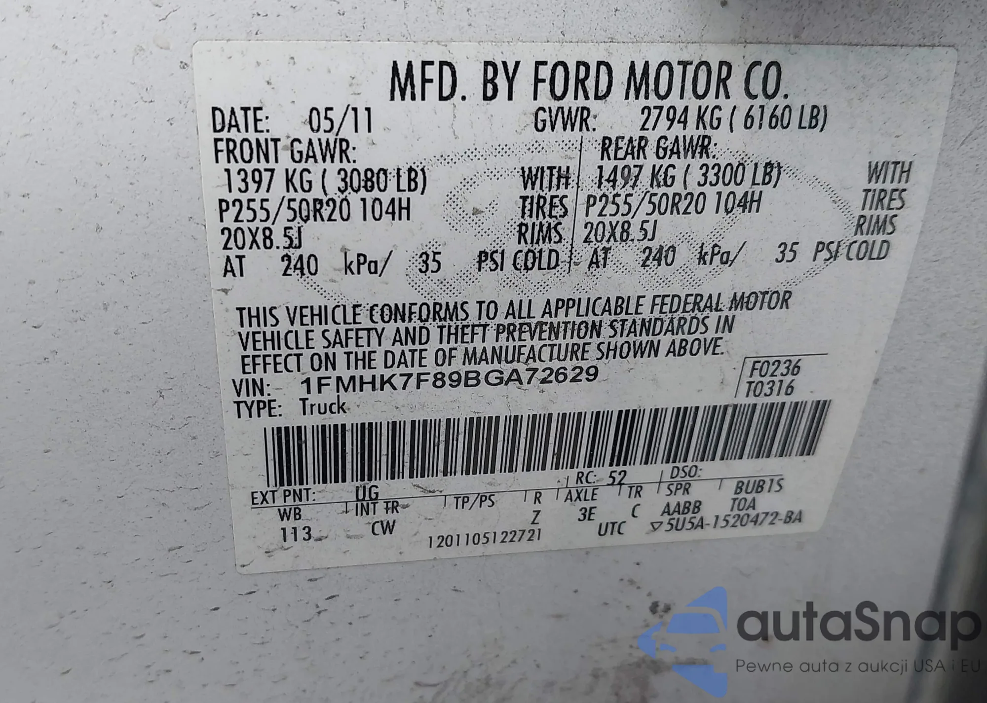 LOT: 43992736 VIN: 1FMHK7F89BGA72629