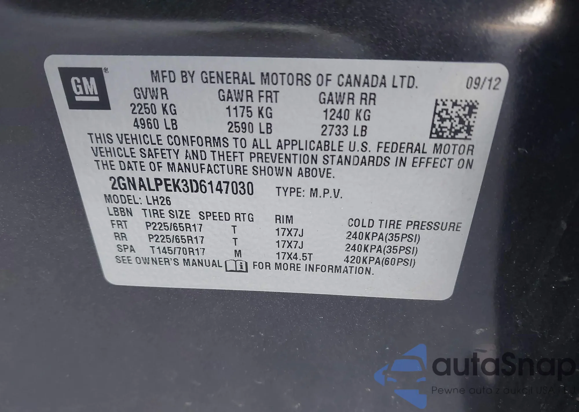 LOT: 43924956 VIN: 2GNALPEK3D6147030