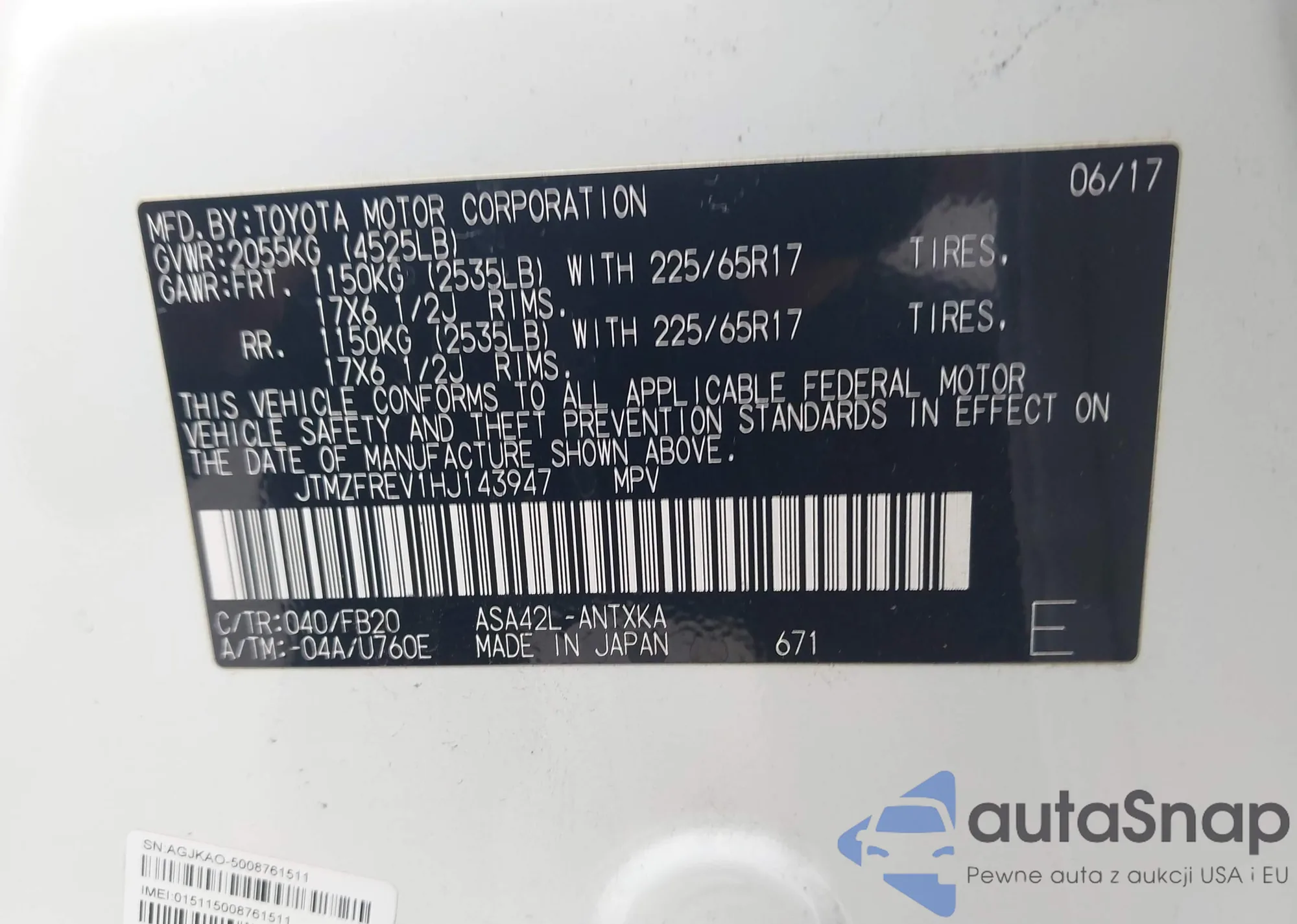 LOT: 43997243 VIN: JTMZFREV1HJ143947