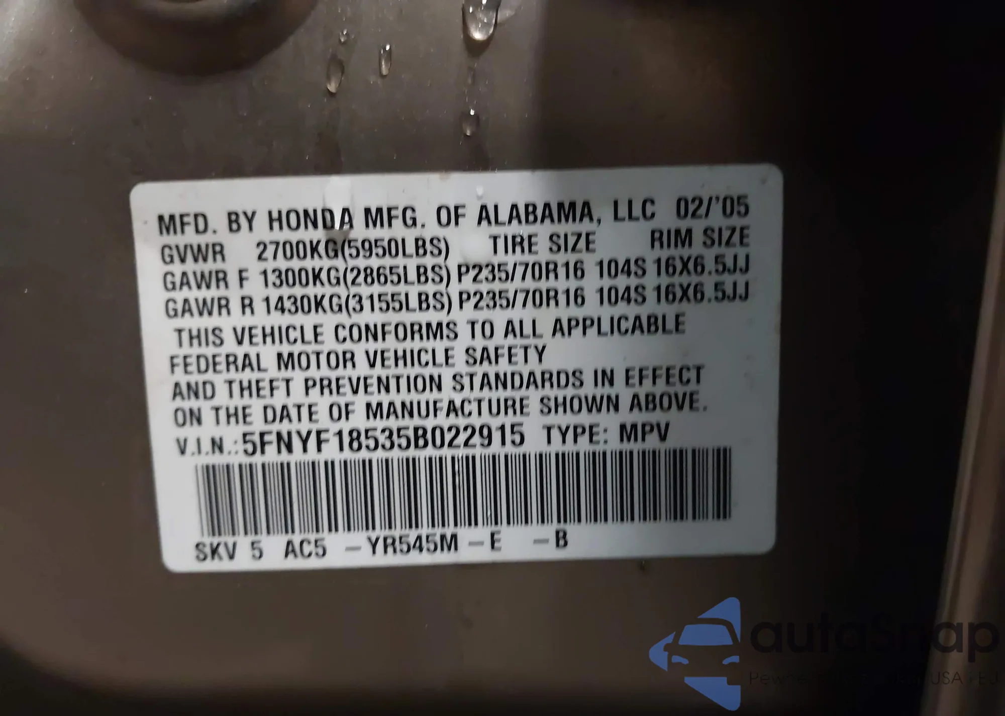 LOT: 44005869 VIN: 5FNYF18535B022915