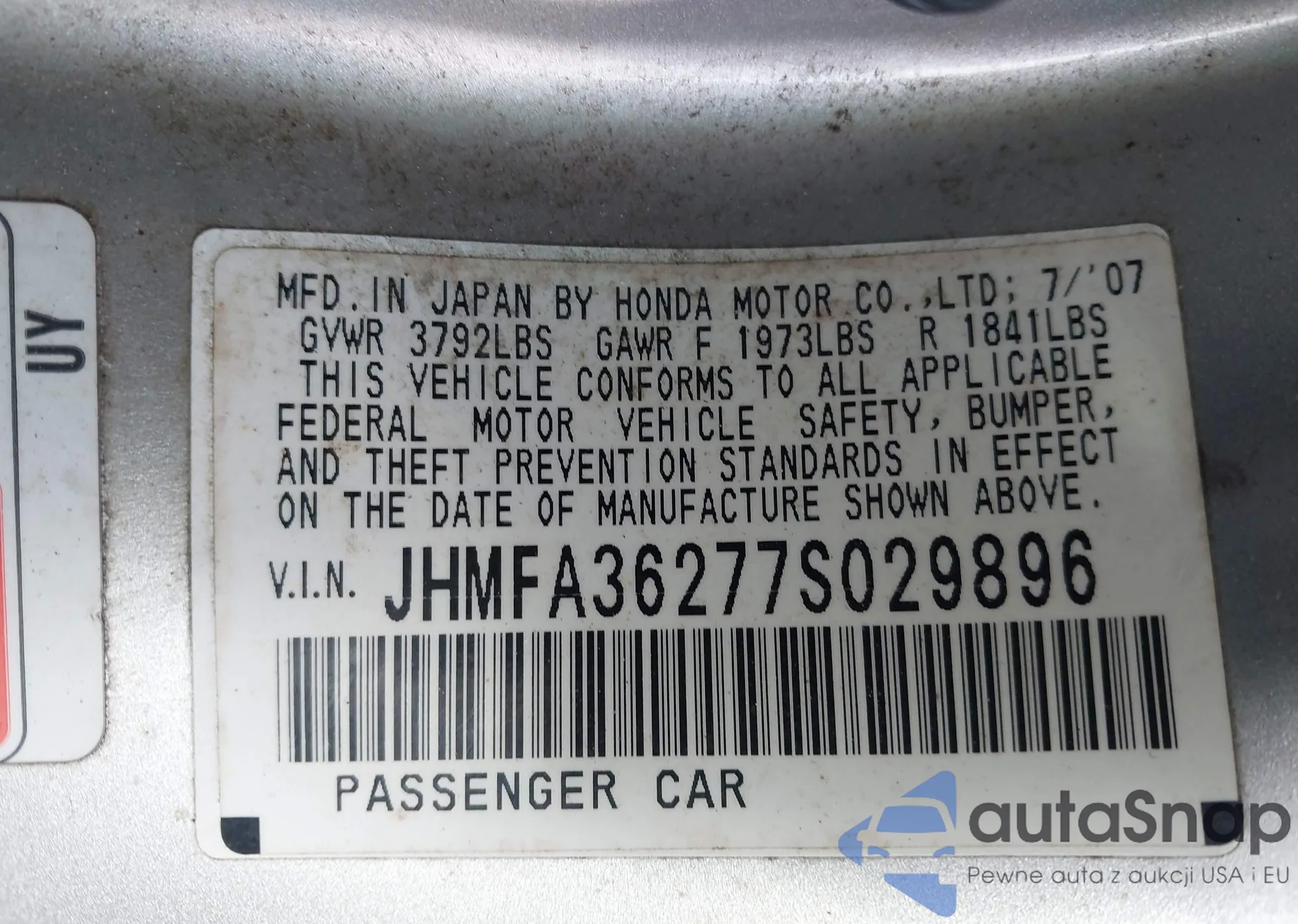 LOT: 43972787 VIN: JHMFA36277S029896