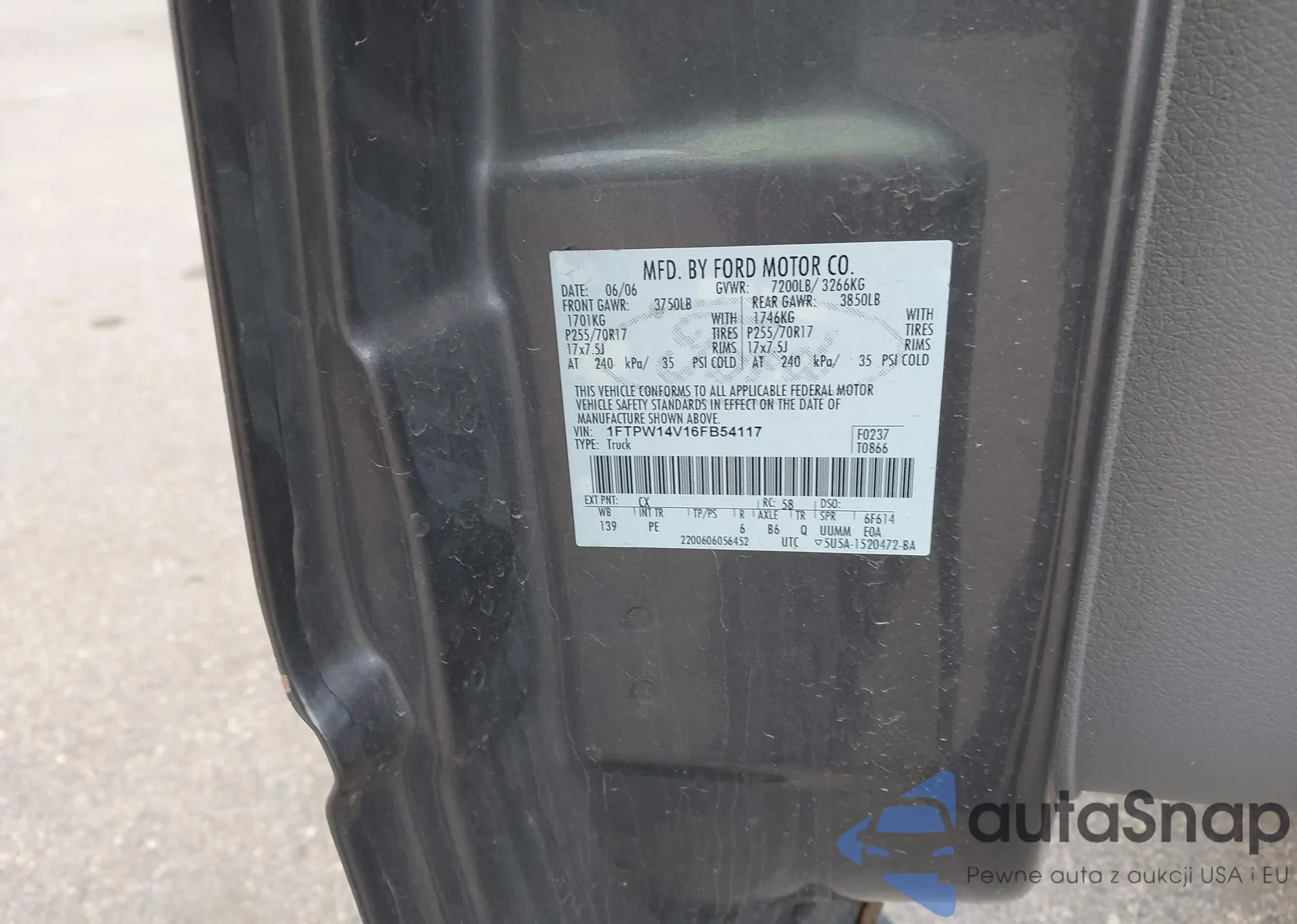 LOT: 43718562 VIN: 1FTPW14V16FB54117
