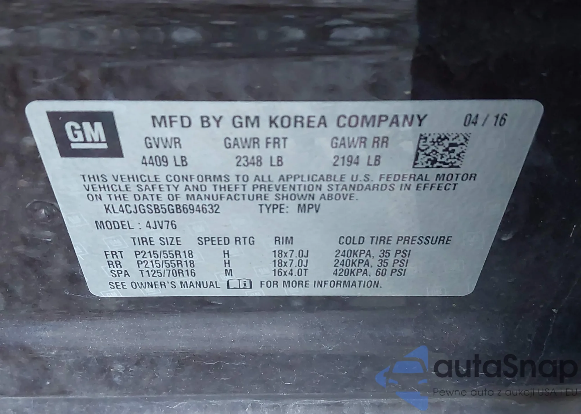 • VIN KL4CJGSB5GB694632