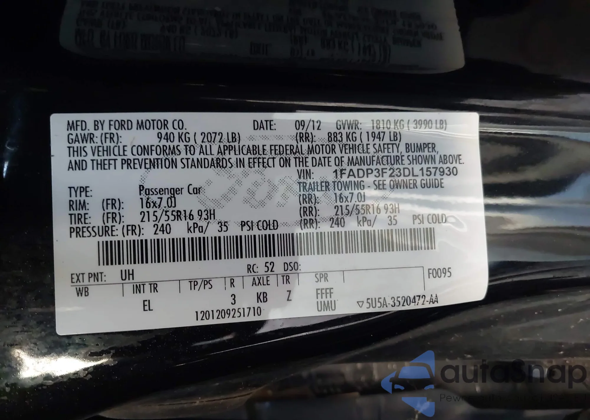 • VIN 1FADP3F23DL157930