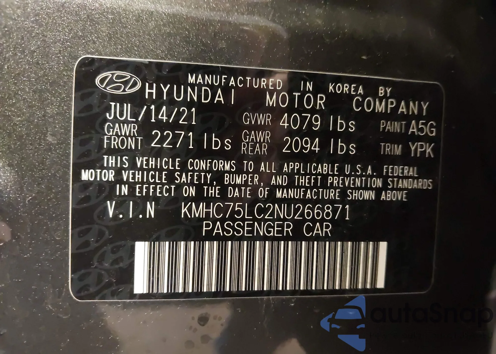 LOT: 43659032 VIN: KMHC75LC2NU266871