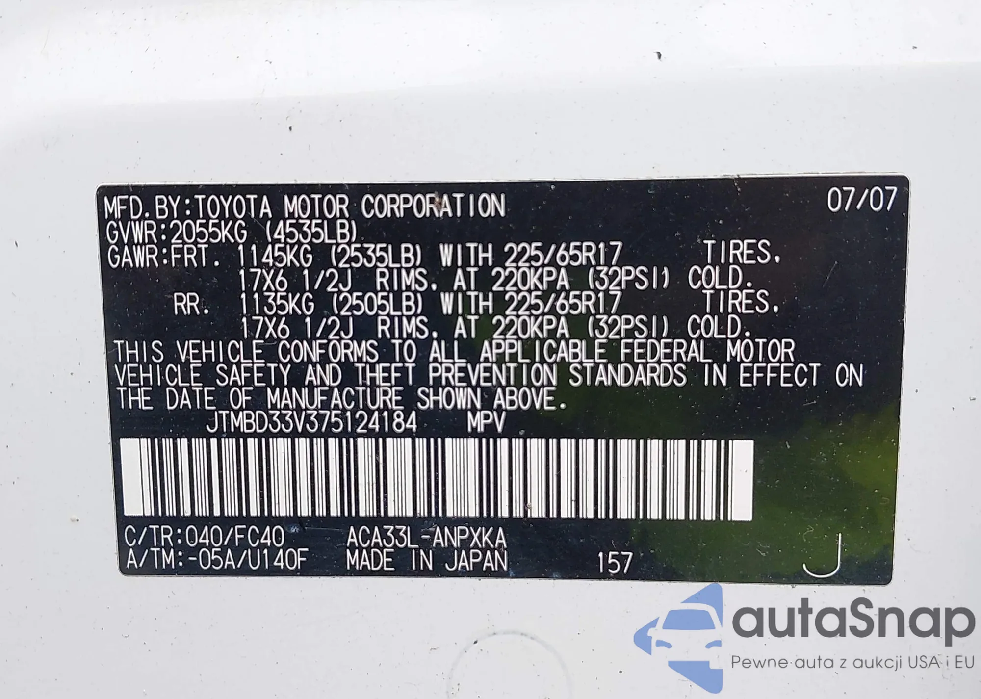 LOT: 43761199 VIN: JTMBD33V375124184