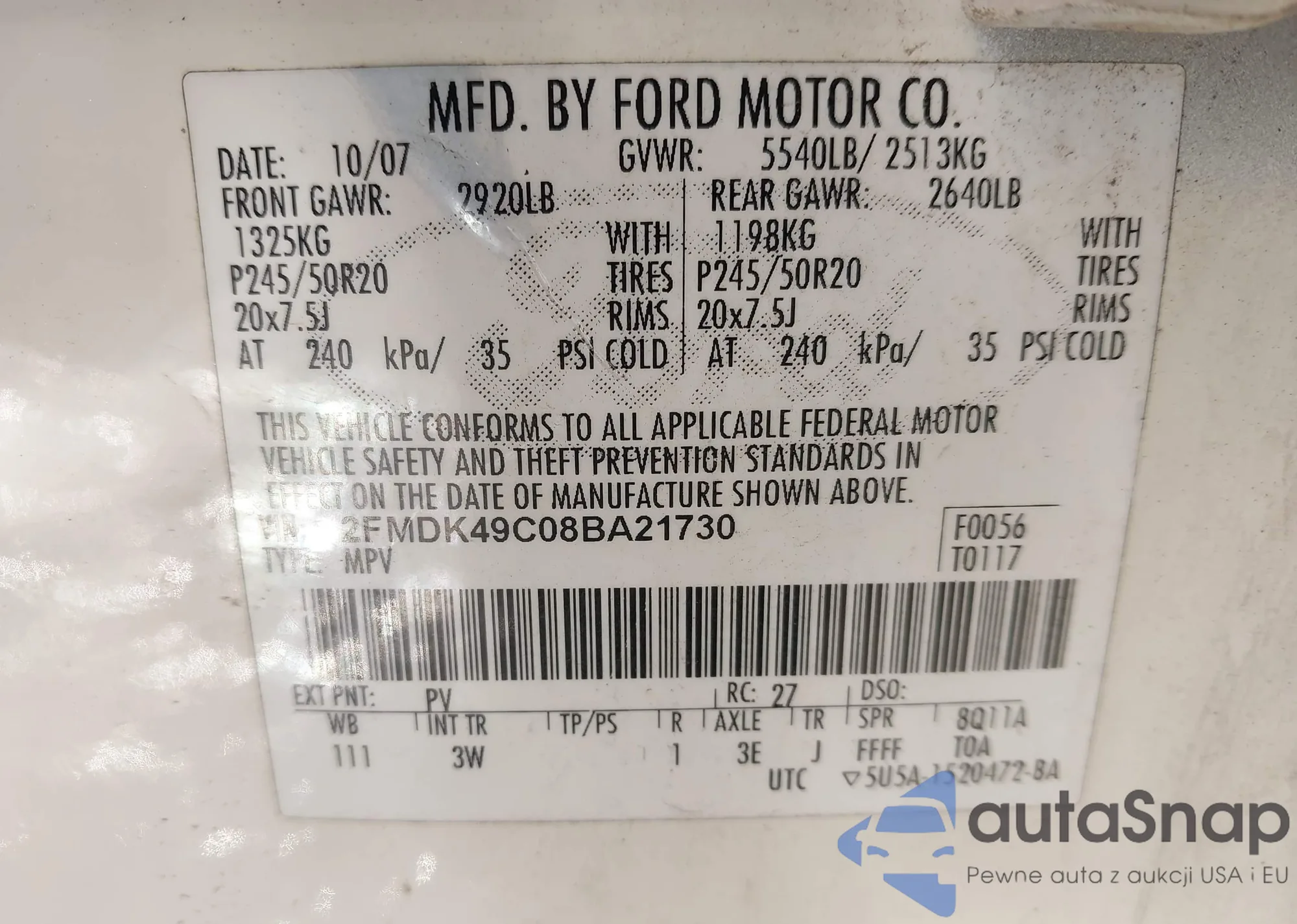 LOT: 44104370 VIN: 2FMDK49C08BA21730