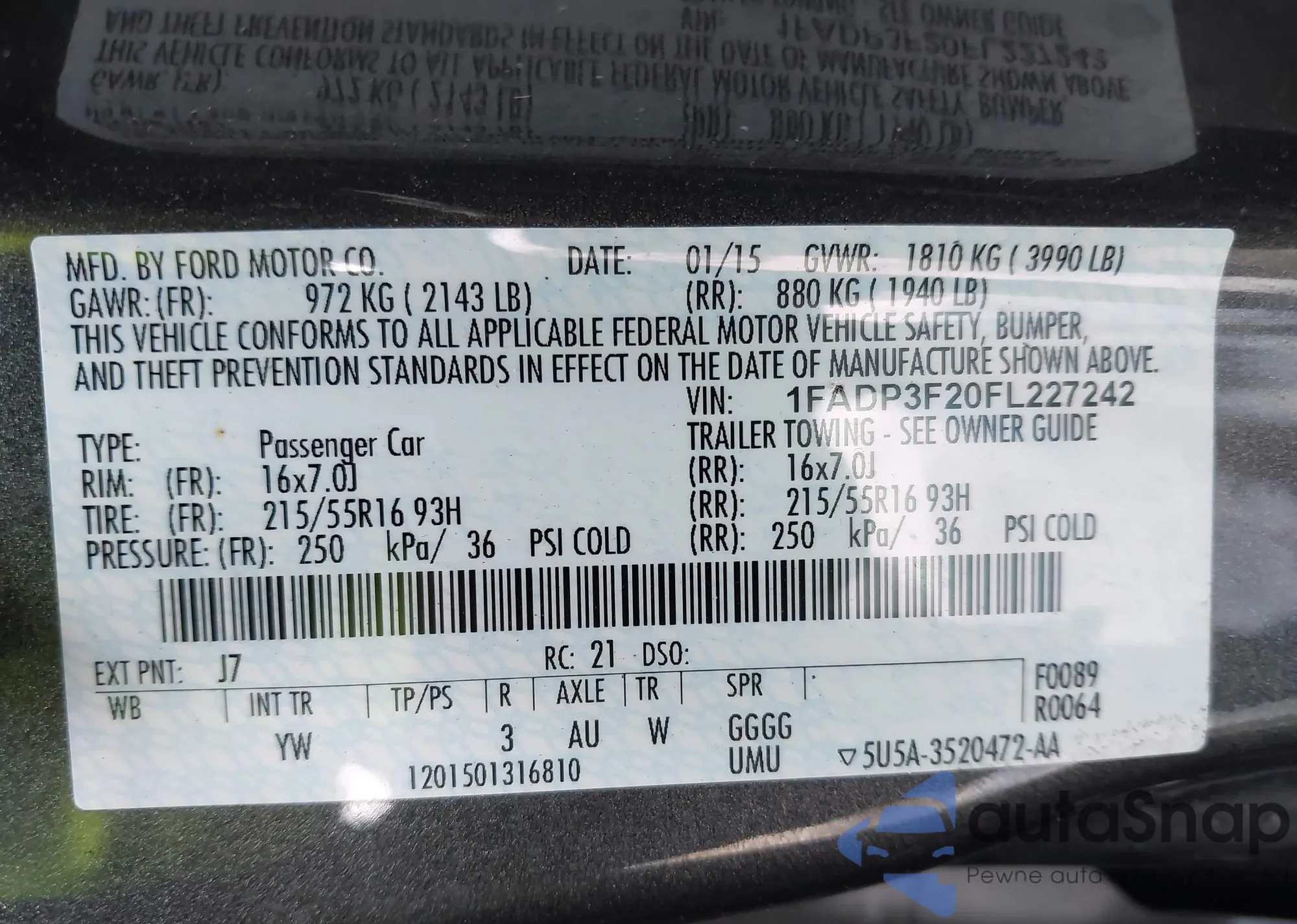 • VIN 1FADP3F20FL227242