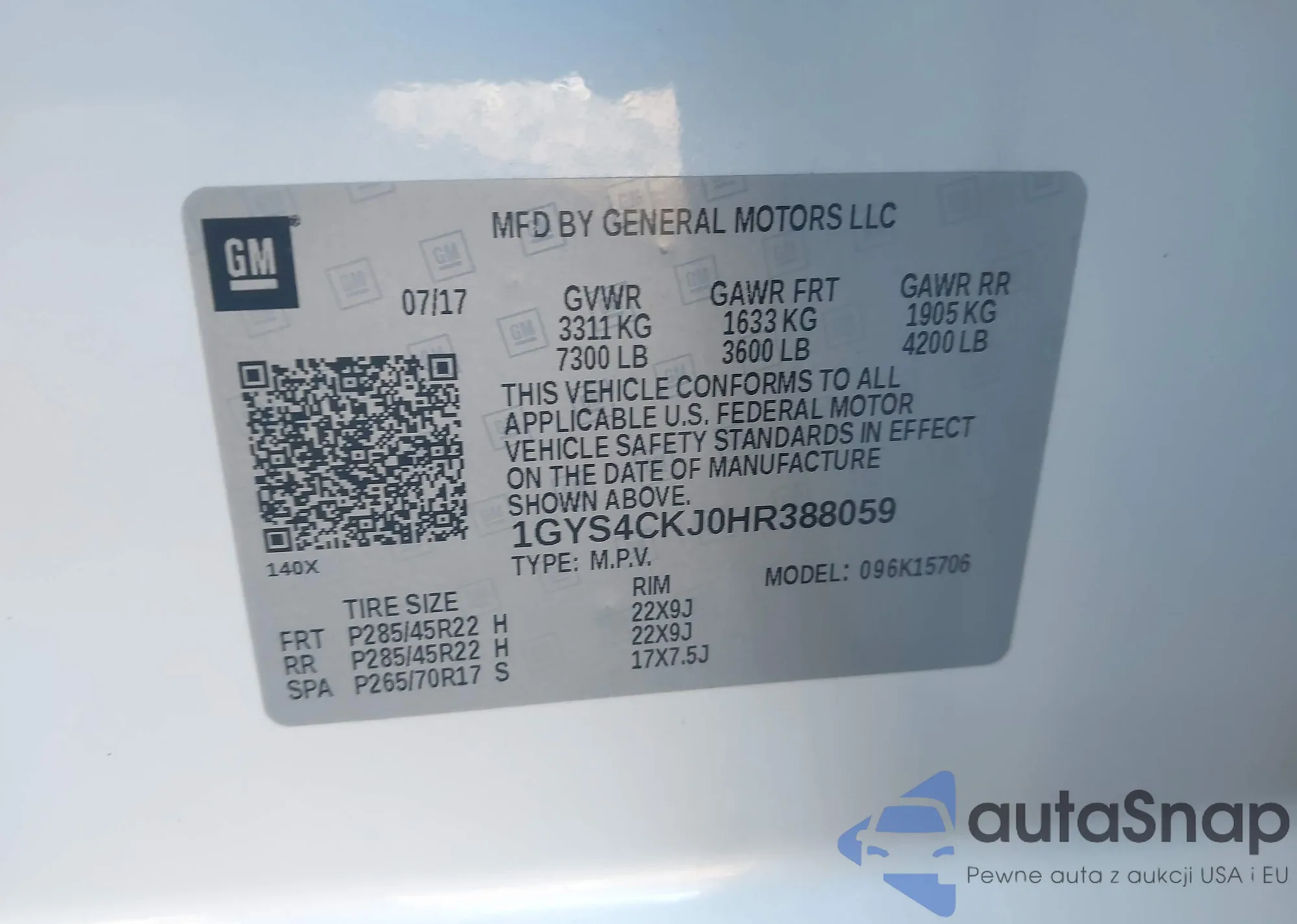 LOT: 43748731 VIN: 1GYS4CKJ0HR388059