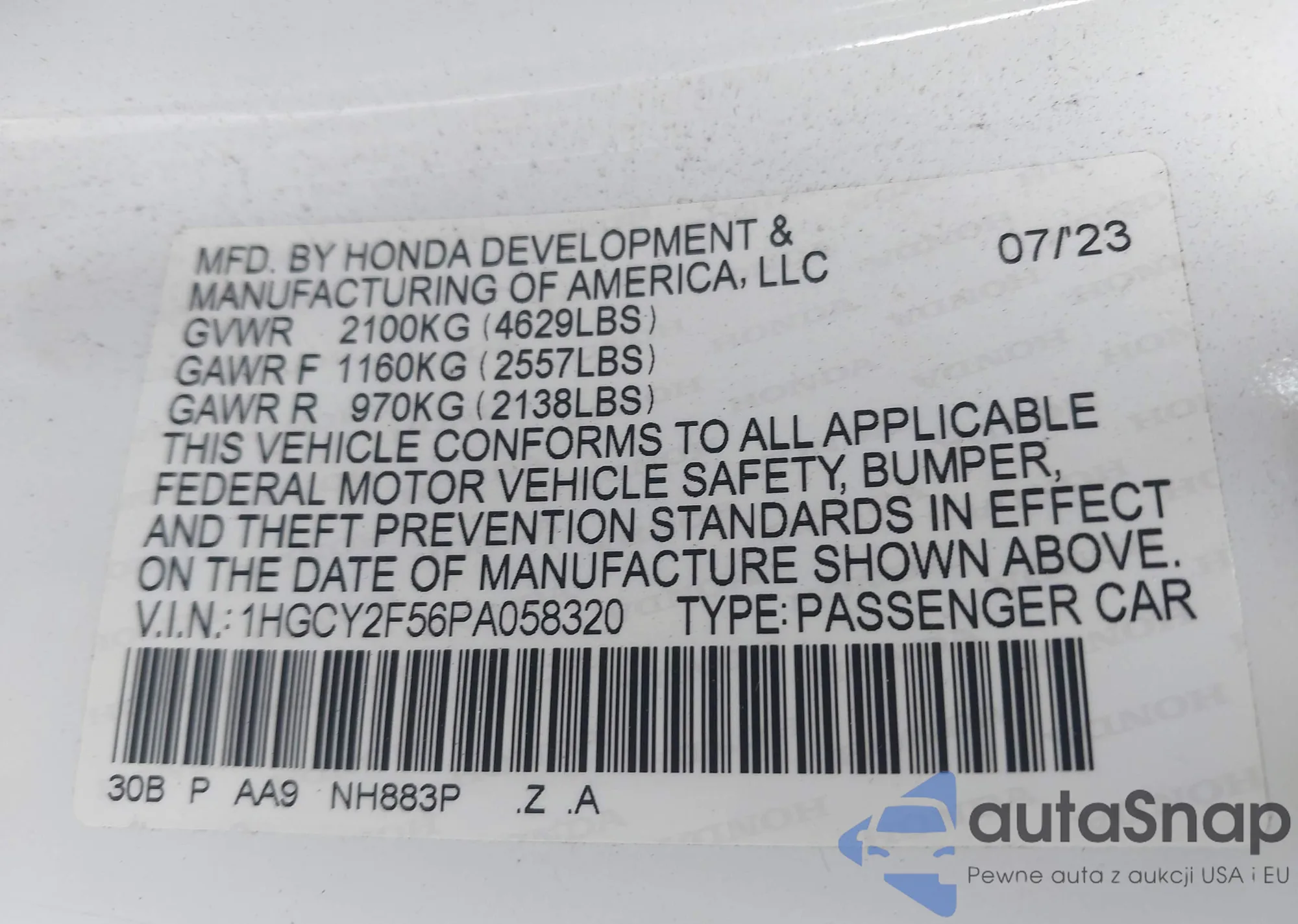 LOT: 43763089 VIN: 1HGCY2F56PA058320