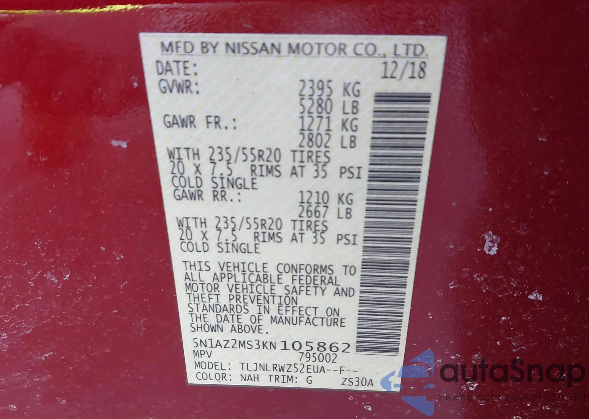 • VIN 5N1AZ2MS3KN105862