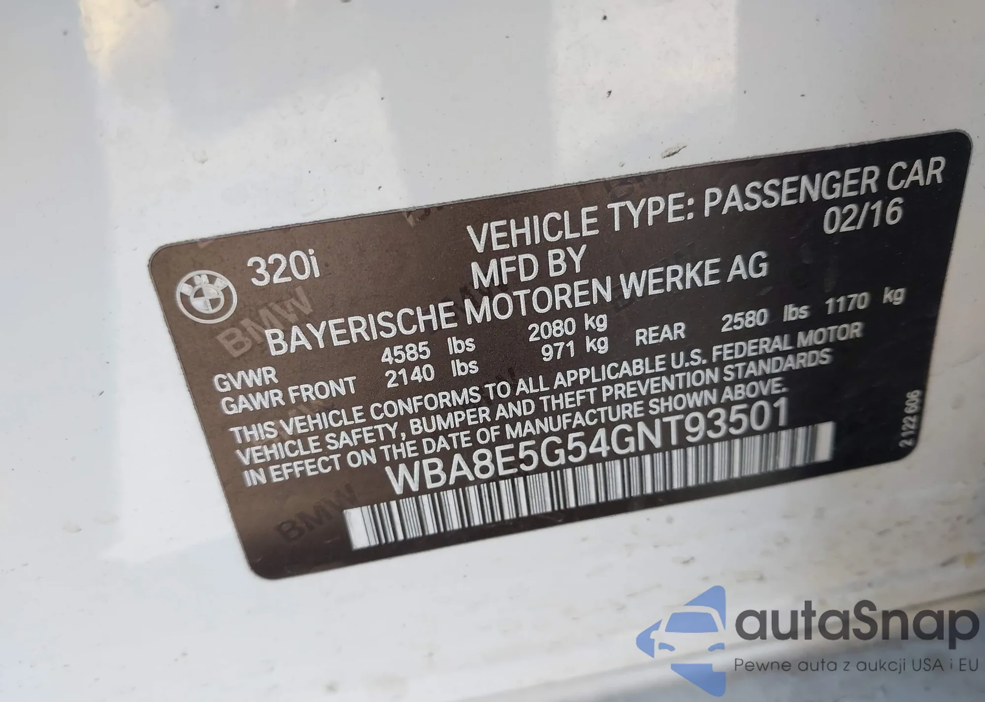 2016 BMW 320I xDrive from USA, damaged, VIN WBA8E5G54GNT93501