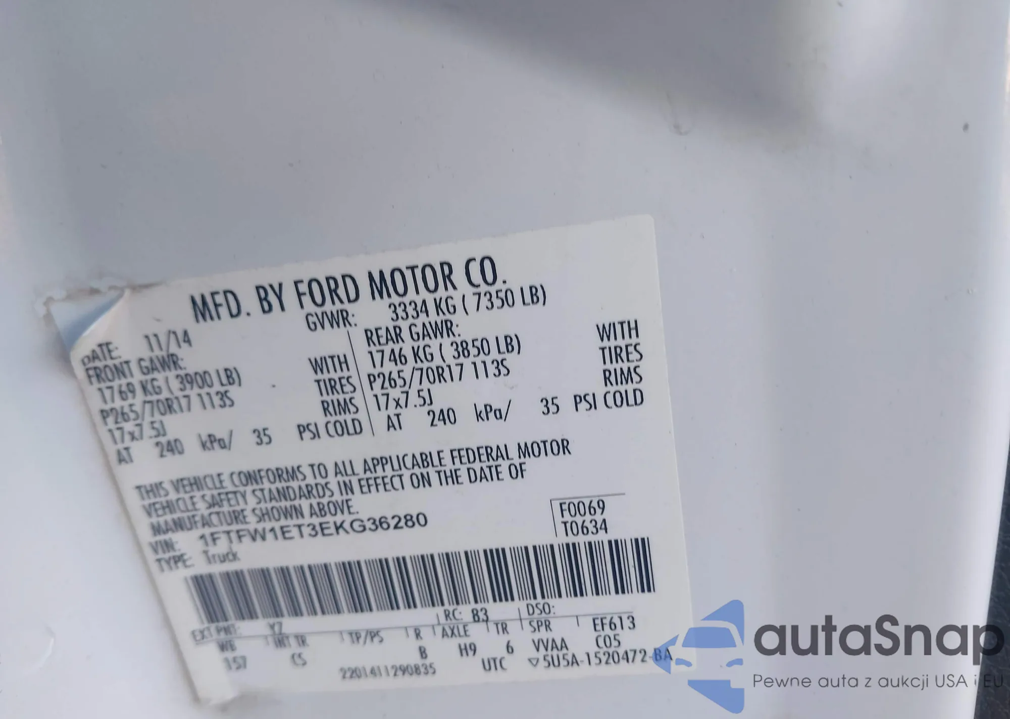 LOT: 43865001 VIN: 1FTFW1ET3EKG36280